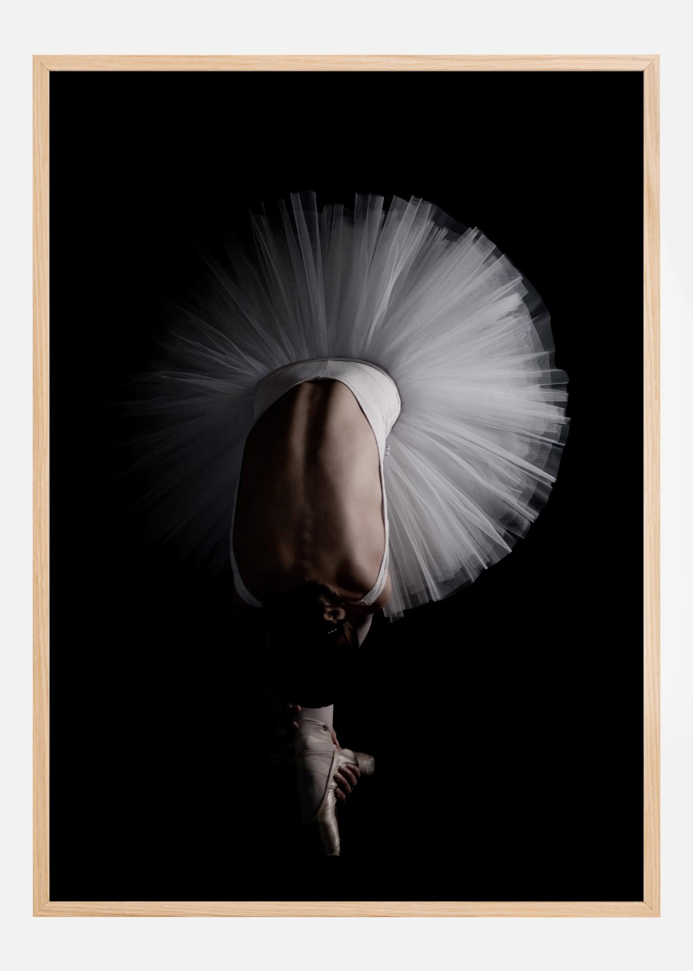 Ein dramatisches Luftbildposter einer Balletttänzerin, die sich nach vorne beugt, um ihre Schuhe zu erreichen. Der dunkle schwarze Hintergrund lässt ihr weißes Tutu in einem hellen Kreis um sie herum aufleuchten. Die starken Linien ihres Rückens lenken den Blick auf die elegant gespitzten Füße. Eleganz und Dramatik vereinen sich in diesem einen Bild.