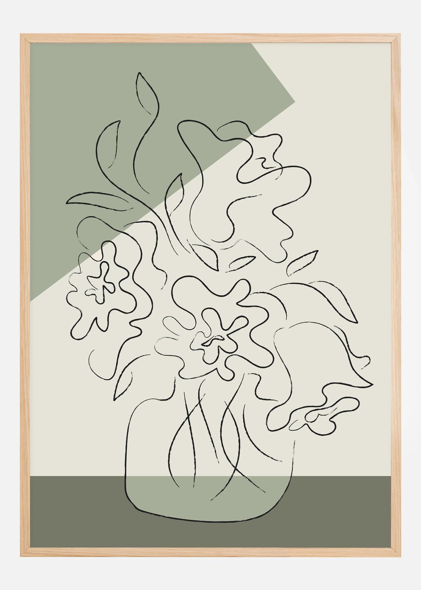 Dieses künstlerisch abstrakte Poster zeigt stilisierte Blütenblätter und Laub in einer eleganten, fließenden Linienzeichnung, die über einem zweifarbigen Hintergrund in sanften grünen und neutralen Tönen schwebt. Die schlichte Schönheit des Designs, verstärkt durch eine subtile Textur, die ein organisches Gefühl vermittelt, schafft eine entspannte und ruhige Atmosphäre. Dieser moderne und stilvolle Druck würde sich perfekt in ein minimalistisches oder skandinavisch inspiriertes Zuhause einfügen und einen Hauch von Naturverbundenheit hinzufügen, ohne den Raum mit zu vielen Farben oder Komplexität zu überfrachten.