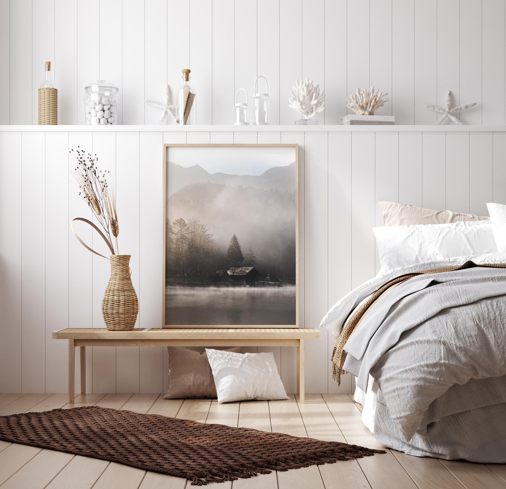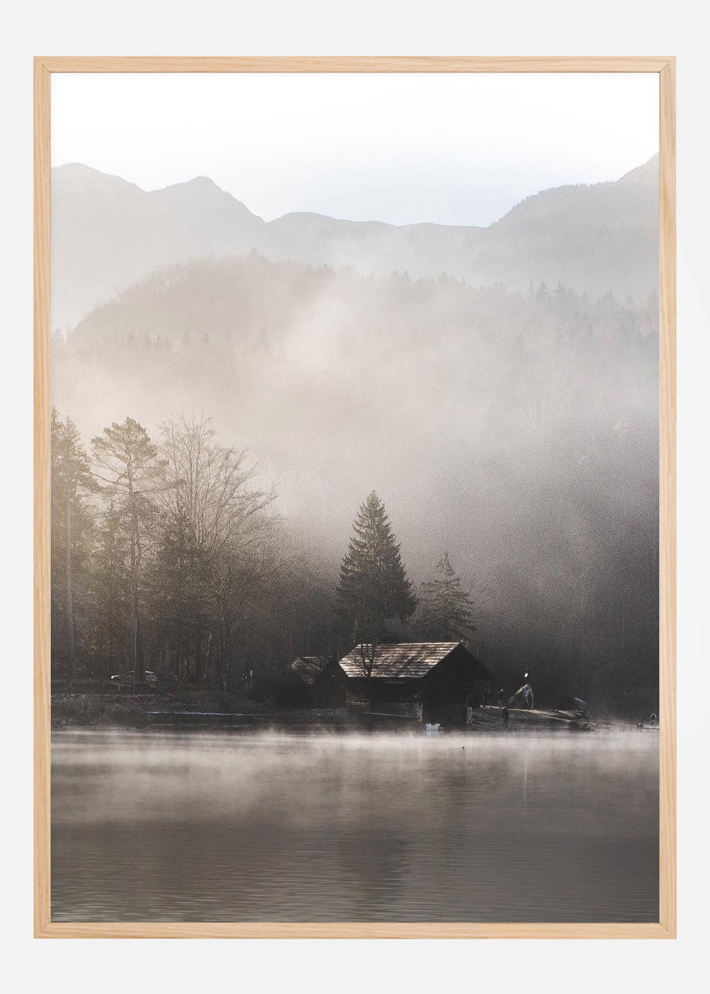 Ein sanftes Poster einer Hütte in den Bergen, die am Rande eines nebligen Sees liegt. Weiche Pastellfarben verleihen diesem Bild eine sanfte Note, während die Morgensonne von rechts herabstrahlt und den Nebel trocknet. Hängen Sie dieses Poster an eine schlichte Wand und verlieren Sie sich in der einsamen Wildnis und der Einfachheit dieses Ambienteposters.