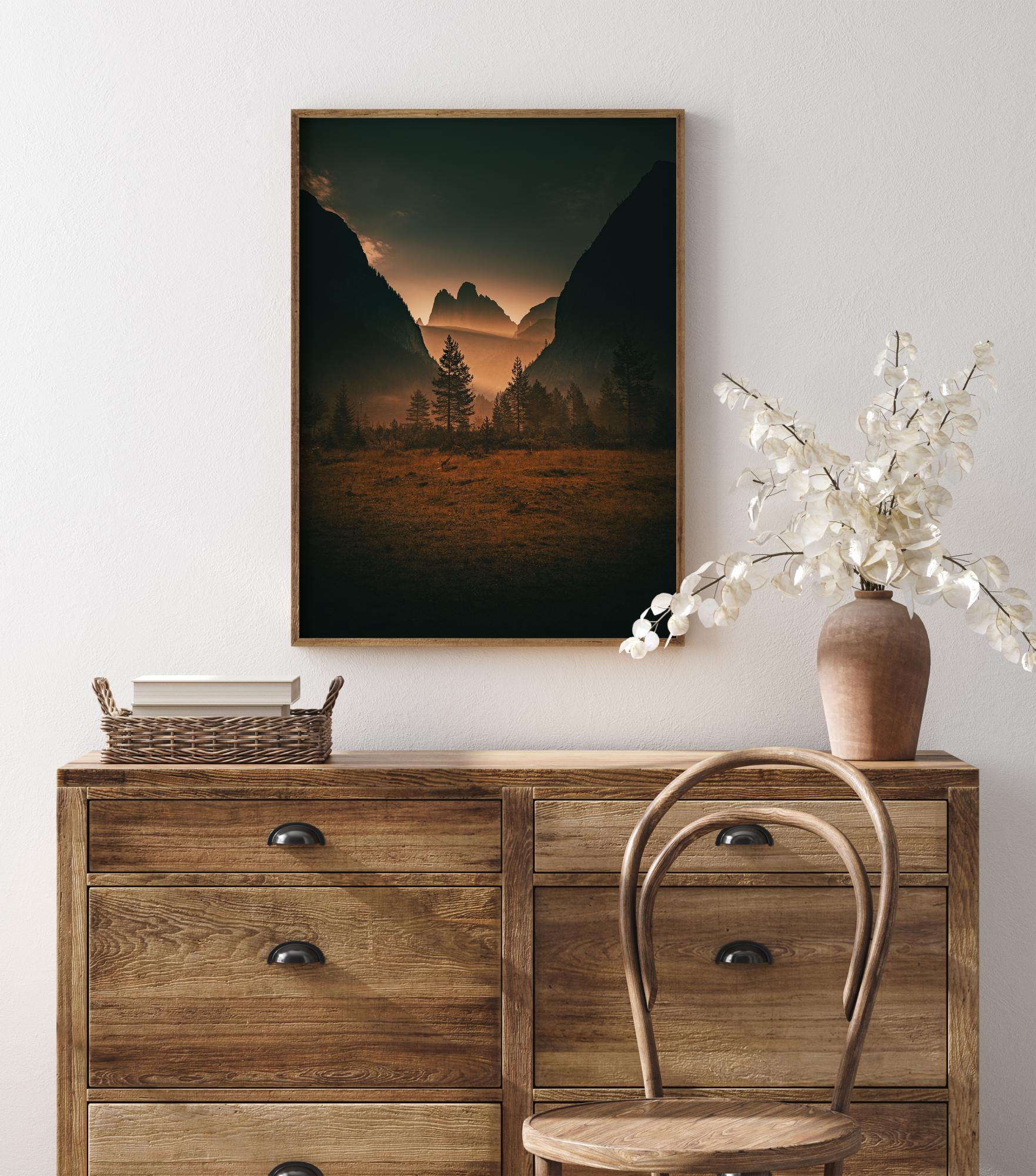 Ein fantastisches Poster eines dramatischen Waldes bei Sonnenuntergang. Ein tief orangefarbenes Feld mit Kiefern im Hintergrund wird von zwei Bergen flankiert, die ein Tal bilden. In der Mitte erheben sich weitere Berge, und die letzten Strahlen des Sonnenuntergangs dringen durch, um ein wahrhaft episches Fantasiegefühl zu erzeugen. Lassen Sie sich in dieses magische Land entführen.