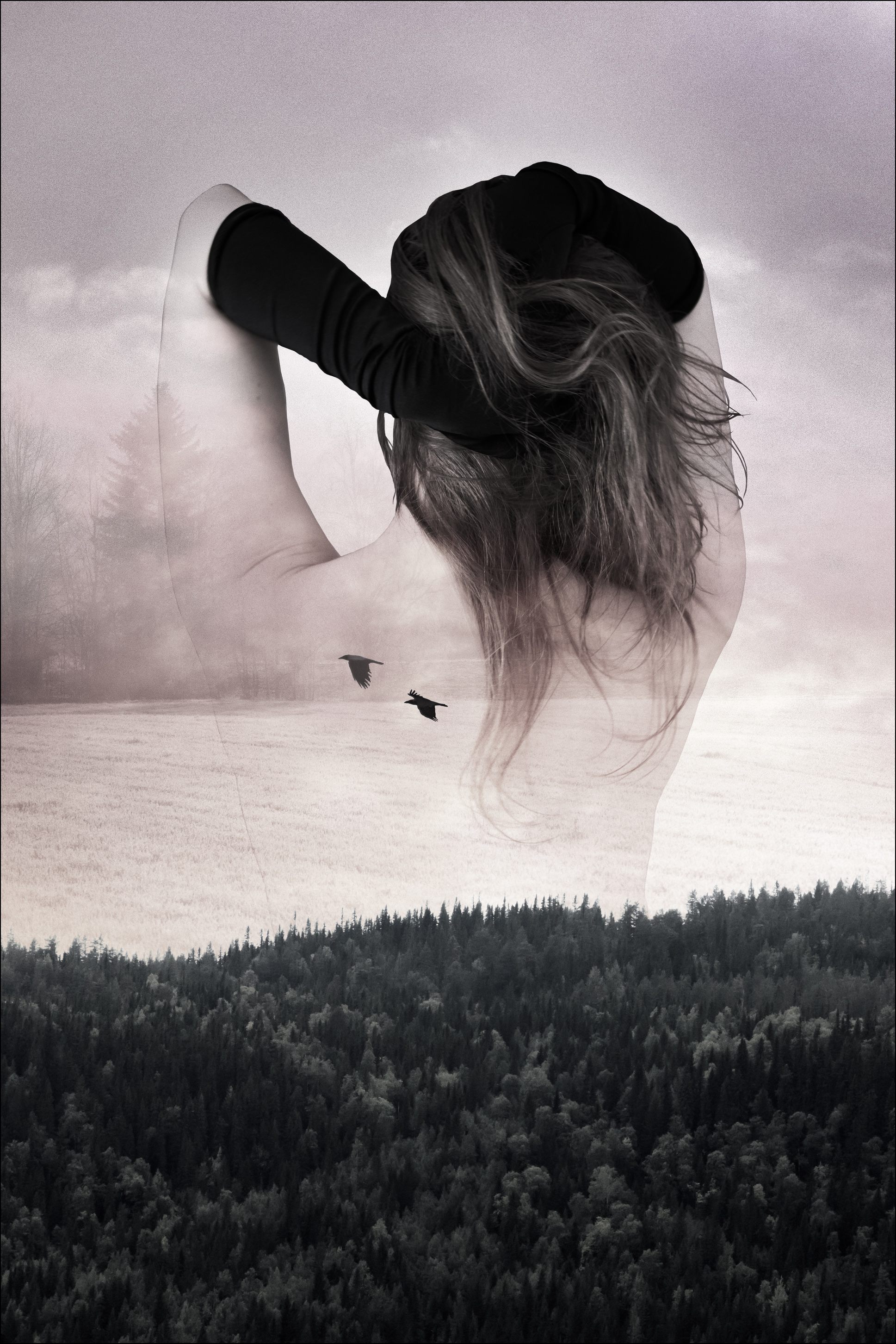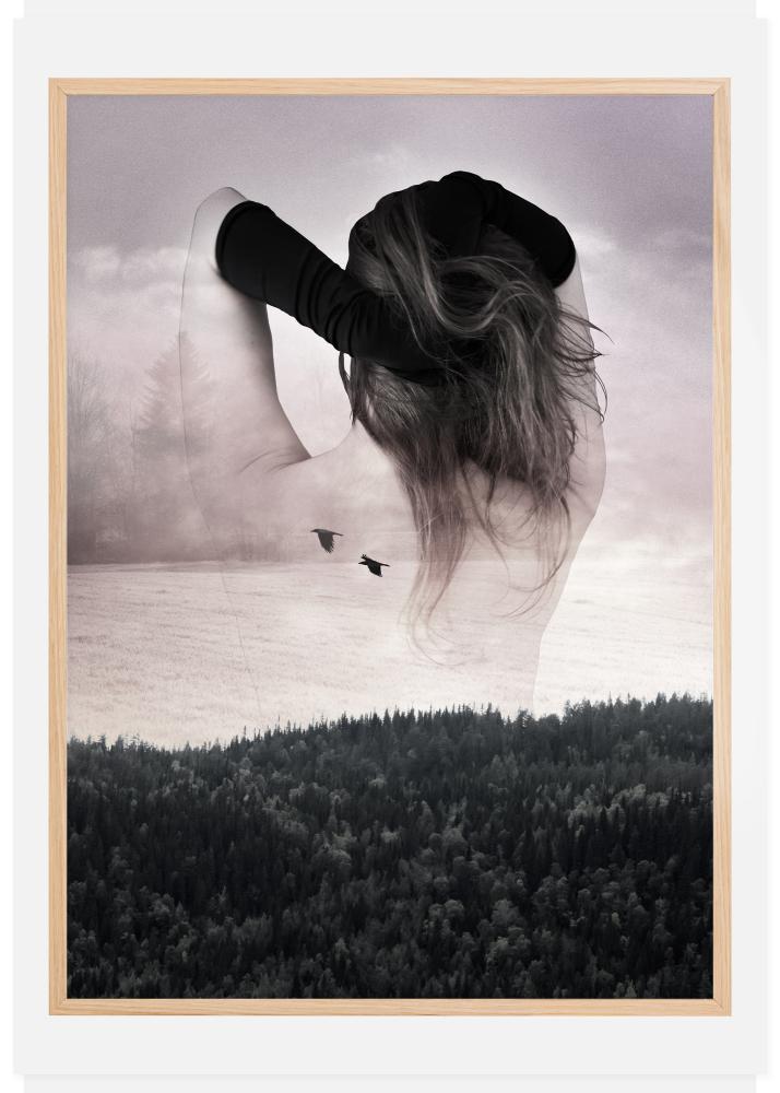 Ein Collage-Poster von Wald und Himmel mit einer darüber liegenden Frau. Die Seele des Waldes wird hier deutlich, denn der dunkle Wald reicht bis in den Himmel, wo eine Frau mit einem schwarzen Handschuh durch ihr Haar streicht. Genießen Sie die seltsame Komposition dieses wahrhaft fantasievollen Werks.