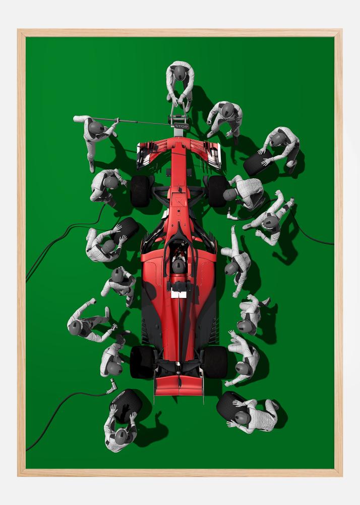 Mit einer Explosion von Farbe und Aktion bietet dieses fesselnde Poster einen Einblick in die adrenalingeladene Welt der Formel 1. Vor einem kräftig grünen Hintergrund wird die ikonische Szene eines Boxenstopps dargestellt, bei der ein Team von Mechanikern in Silber und Weiß in perfekter Synchronisation um ein leuchtend rotes Rennfahrzeug arbeitet. Diese kontrastreiche Komposition ist eine Hommage an die Kunst der Geschwindigkeit und die Präzision des Motorsports.
