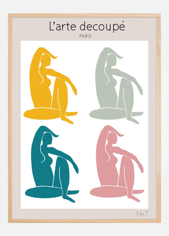 Dieses farbenfrohe und zeitgenössische Poster aus der Serie 'L'arte découpé' präsentiert vier stilisierte Figuren in einer dynamischen und harmonischen Komposition. Jede Figur ist sorgfältig in einer unverwechselbaren Farbe gestaltet - Sonnengelb, Himmelblau, sanftes Grün und warmes Rosa - und ist vor einem grauen Hintergrund platziert, der einen ruhigen und ausgewogenen Ausdruck verleiht. Dieser künstlerische Druck würdigt die Vielfalt und Bewegung der menschlichen Form durch sein abstraktes und vereinfachtes Design und schafft einen starken visuellen Eindruck, der gut in einen modernen Einrichtungsstil passt.