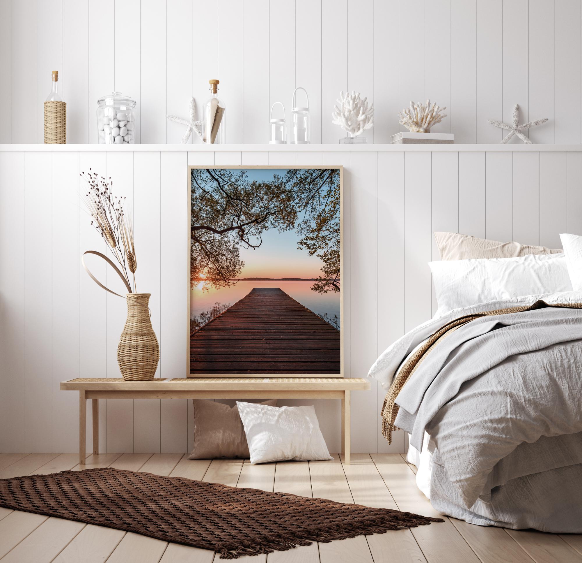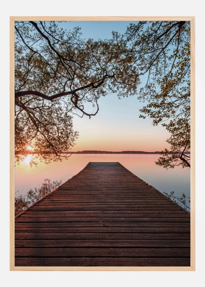 Ein Ambiente-Poster eines Weges, der an einem hellen Tag auf einen See hinausführt. Baumzweige umrahmen den Weg, der in den pfirsichfarbenen und blauen See und Himmel führt. Holen Sie sich ein Gefühl von Freiheit nach Hause.
