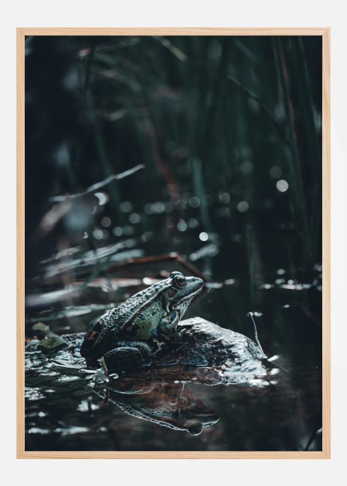 Dieses bezaubernde Poster fängt die Essenz eines stillen Moments in der Natur ein, in dem ein einzelner Frosch auf einem Stein mitten in einem dunklen und mysteriösen Teich abgebildet ist. Die satten grünen Farbtöne des Frosches betonen seine Lebendigkeit vor dem dunklen, nebligen Hintergrund und den glitzernden Lichtpunkten auf der Wasseroberfläche. Seine Spiegelung auf der ruhigen Wasseroberfläche trägt zu einer tiefen und nachdenklichen Stimmung bei.
