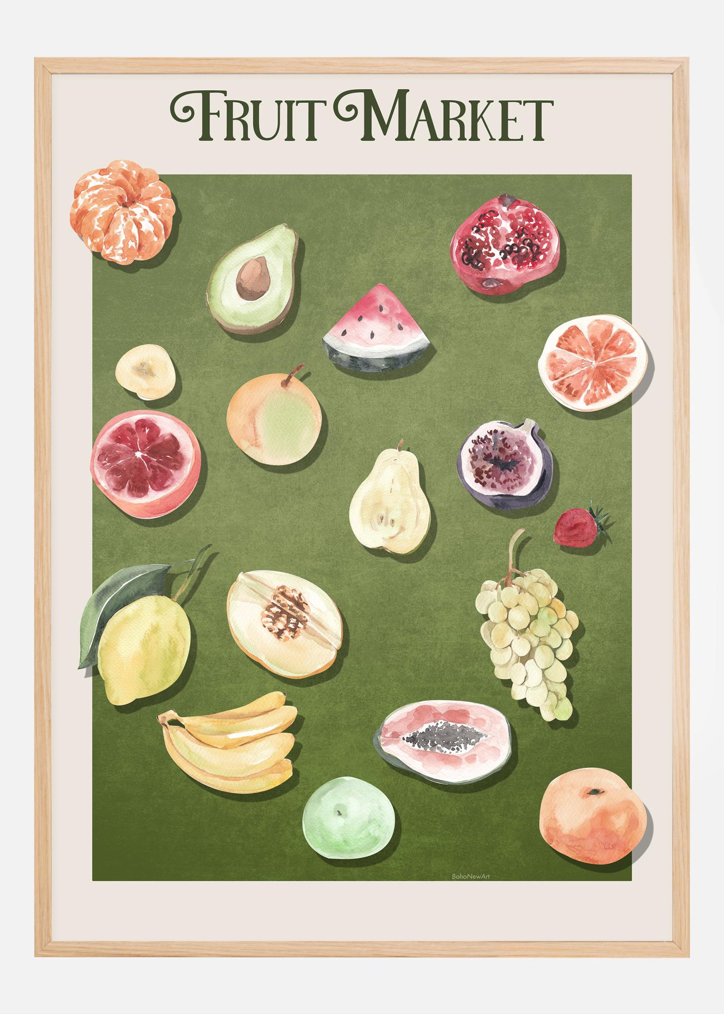 Dieses farbenfrohe Poster fängt die Essenz eines lebhaften Obstmarktes ein und ist eine fantastische Ergänzung zu unserer Kollektion von Innendekorationen. Der Druck ist ein Augenschmaus mit einer Reihe saftiger Früchte, die vor einem satten grünen Hintergrund präsentiert werden und ein Gefühl von Frische und Überfluss schaffen. Von den sonnengereiften Zitrusfrüchten bis hin zu den tropischen Akzenten von Avocado und Granatapfel bietet dieses Werk ein visuelles Fest, das sowohl inspiriert als auch erfreut. Jede Frucht ist mit einer Detailtreue dargestellt, die ihre einzigartigen Texturen und Formen hervorhebt, was dieses Poster zu einem Muss für alle macht, die naturgetreue Kunst schätzen.