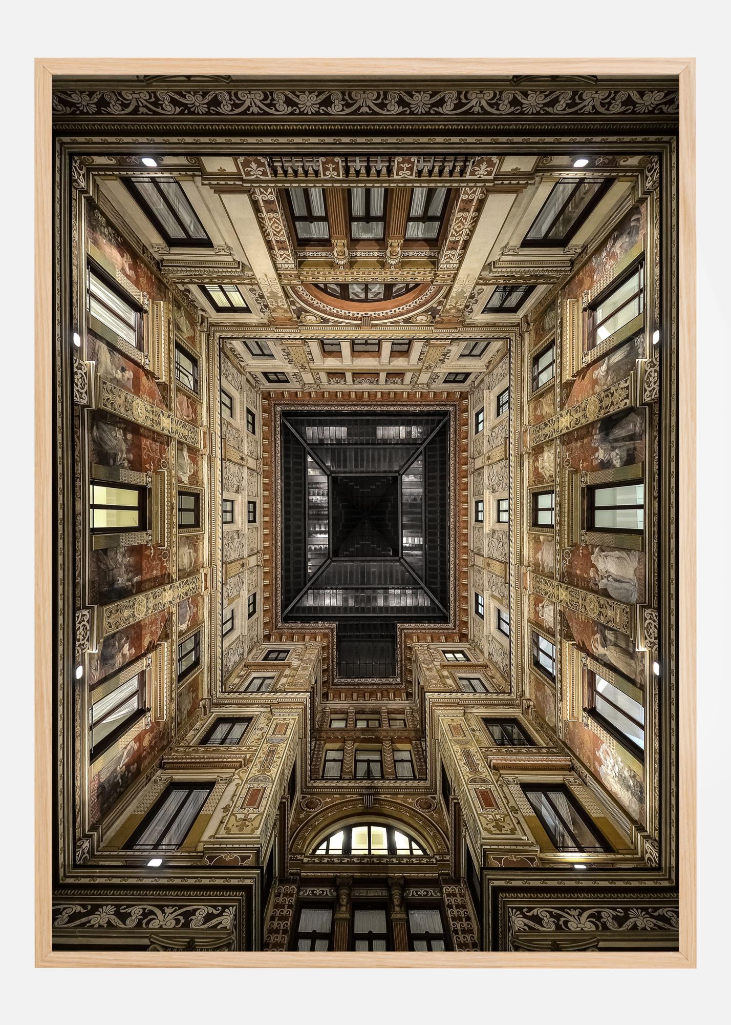 Ein Innenposter der Galleria Sciarra und ihrer atemberaubenden Architektur. Stellen Sie sich vor, Sie befänden sich im Gebäude selbst, während Sie zur Decke hinaufschauen und die atemberaubende Anordnung der Fenster und die verschlungenen Designs sehen. Holen Sie sich ein Stück Reise in Ihr Zuhause.