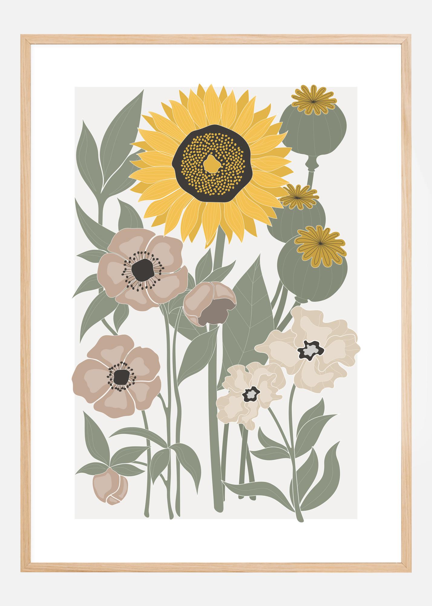 Ein Softprint-Poster mit verschiedenen Blumen. Eine leuchtende Sonnenblume dominiert in der Mitte dieses Bildes mit anderen Blumen wie Mohnblumen in diesem Gartenposter. Der einfache Druckstil macht es einfach, die Details zu sehen und dieses sonnige Bild zu genießen.