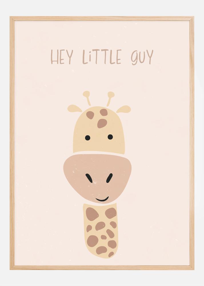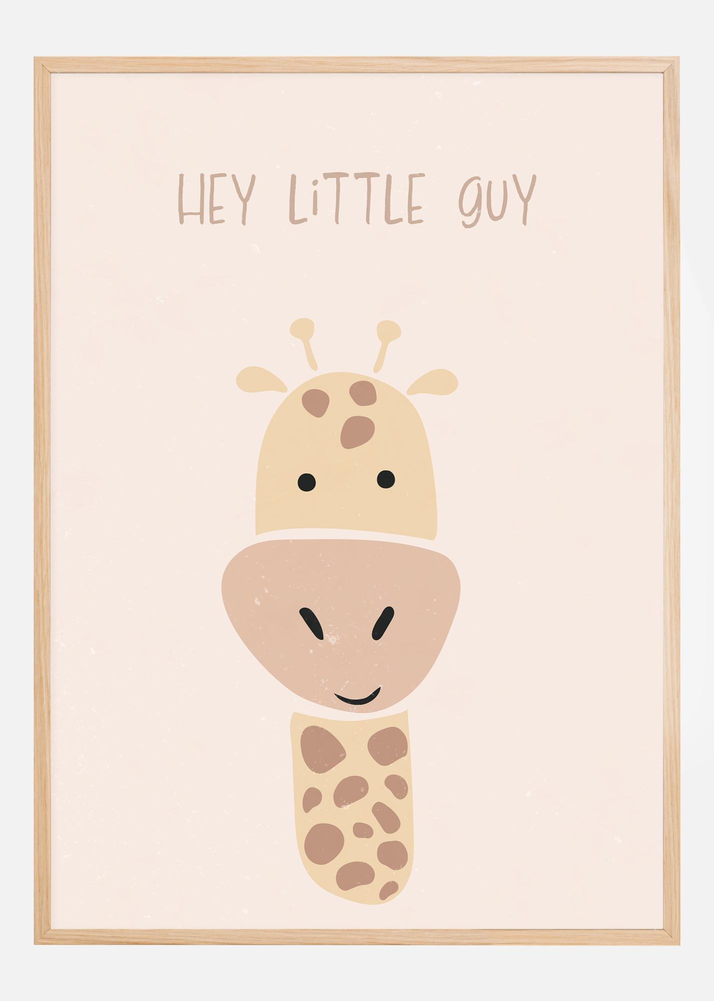 Dieses charmante Poster mit dem Text "HEY LITTLE GUY" und einer Illustration eines kleinen Giraffenkalbs ist die perfekte Wanddekoration für ein Kinderzimmer oder ein verspieltes Detail in einem anderen hellen Raum. Das Motiv zeichnet sich durch sanfte Farben wie weiches Rosa im Hintergrund und warme Beige- und Brauntöne in der Zeichnung der Giraffe aus. Die gezeichnete Giraffe, mit ihrem einfachen und kinderfreundlichen Design, trägt ein großes Lächeln und freundliche Augen, was eine sofortige Verbindung schafft und zu einer fröhlichen und einladenden Atmosphäre beiträgt.