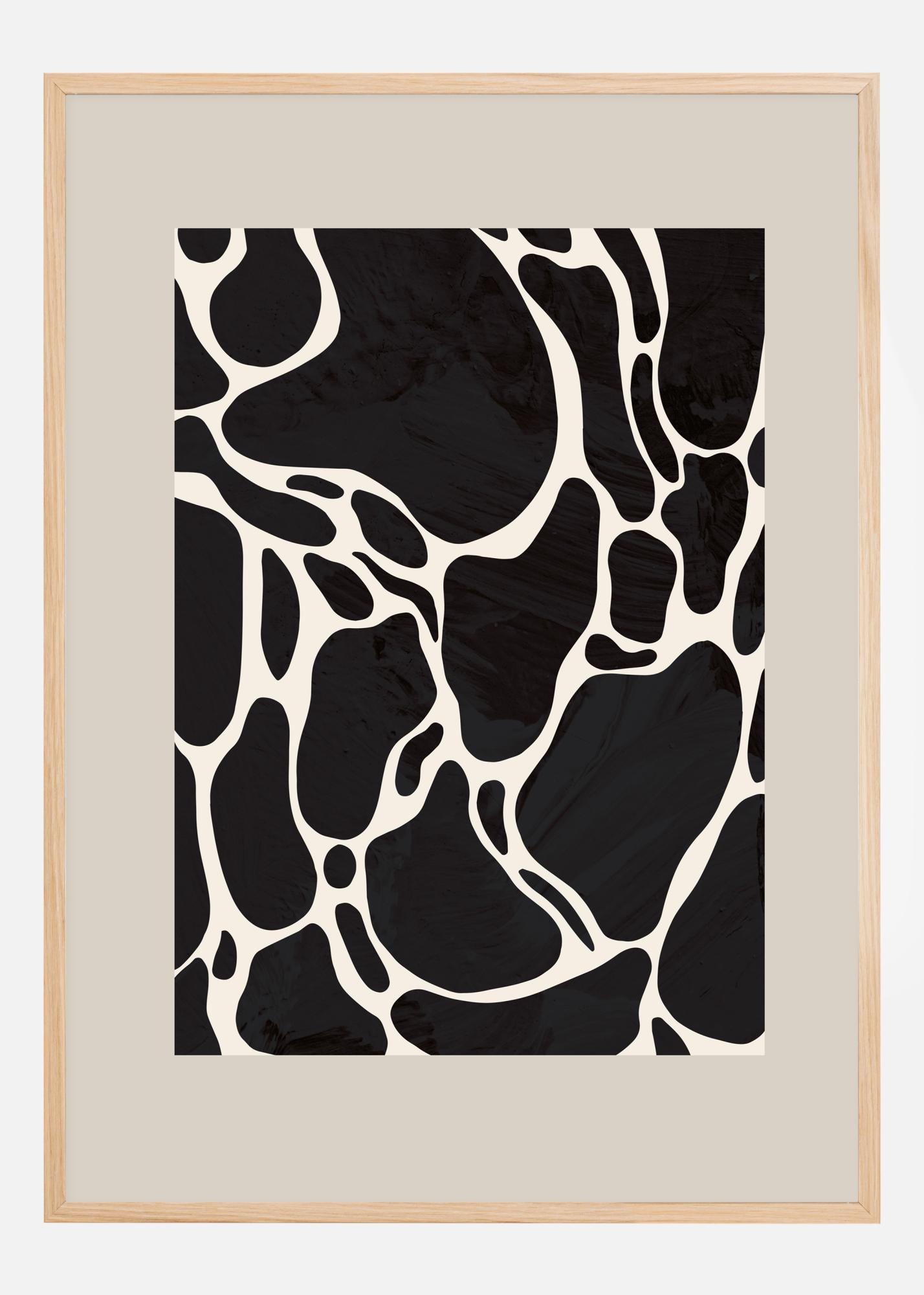 Ein grafisches Poster mit Giraffenflecken in Schwarz und Weiß. Die großen, malerischen schwarzen Kleckse erzeugen ein fesselndes Bild, da sie mit Pinselstrichen durchzogen sind, die für Struktur sorgen. Die dicken weißen Linien, die die Giraffenflecken kreuzen, sorgen für Fluss und Bewegung in dem Werk.