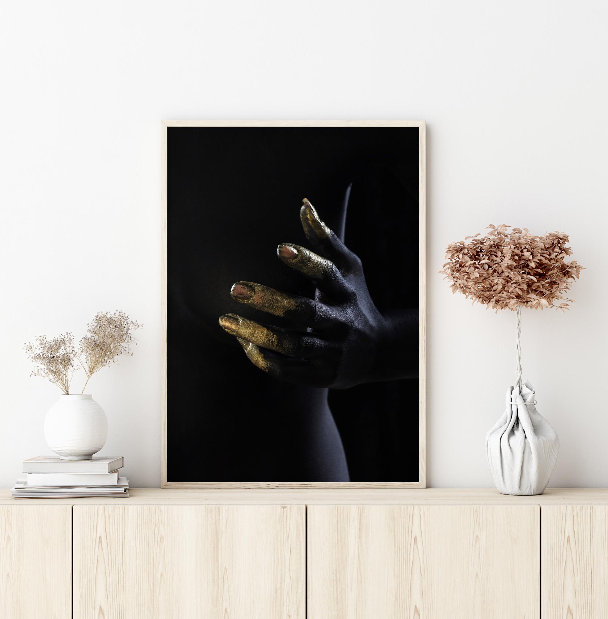 Ein kontrastreiches Poster voller Dramatik, auf dem sich eine Hand nach vorne streckt. Die Hälfte der Hand ist schwarz, während die Finger der ausgestreckten Hand golden bemalt sind. Ein Teil eines Körpers ist zu sehen, der mit Licht von rechts beleuchtet wird und sich vom schwarzen Hintergrund abhebt. Ein wahrhaft künstlerisches Werk, das sich perfekt für jede neutrale Wand eignet.