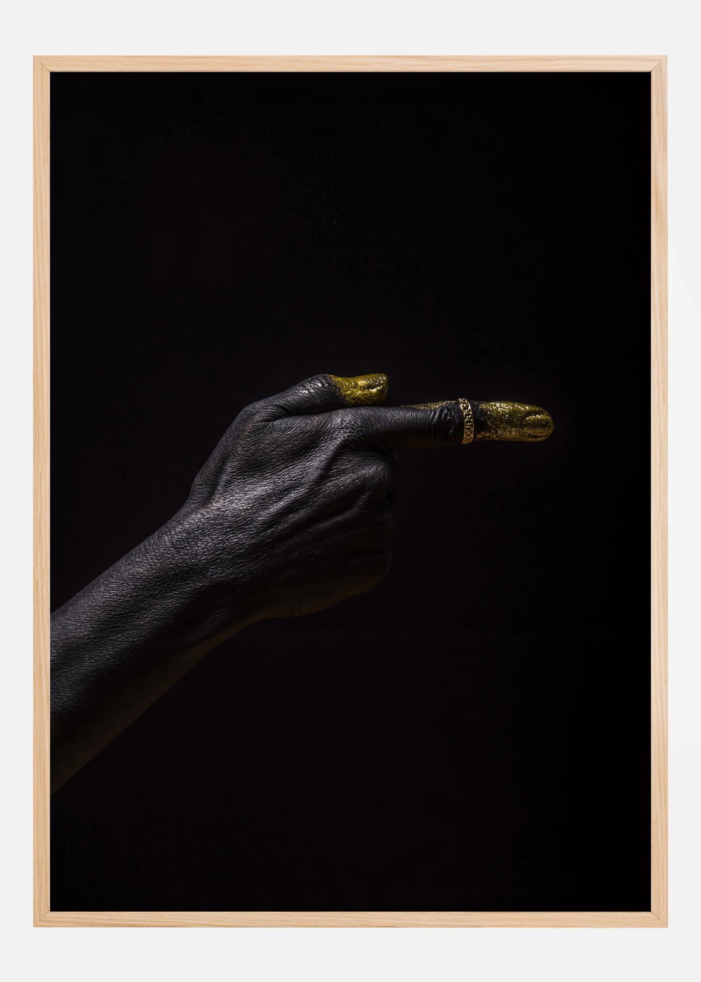 Ein künstlerisches Poster mit einer Hand, die einen Finger wie eine Pistole zeigt. Der größte Teil der Hand ist schwarz gemalt, aber die Finger sind bis zum ersten Fingerknöchel golden bemalt. Die Hand zeigt wie eine Pistole auf die rechte Seite, hebt sich aber vom schwarzen Hintergrund ab. An einer cremefarbenen Wand sieht das Bild besonders dramatisch aus.