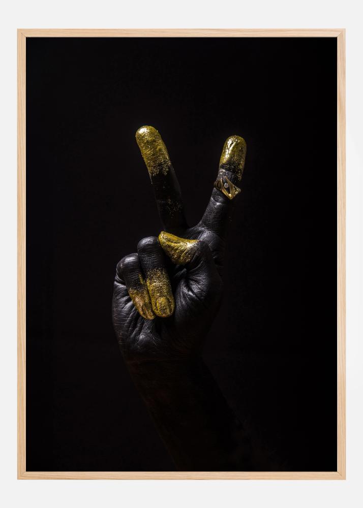 Ein friedliebendes Poster mit einer Hand, die sich zum Friedenszeichen erhebt. Die schwarze Hand ist vor dem schwarzen Hintergrund fast unsichtbar. Alle Finger sind jedoch goldfarben bemalt, so dass das V der Finger deutlich hervorsticht. Das Poster sorgt für eine entspannte Atmosphäre, wenn Sie es zu Hause an die Wand hängen.