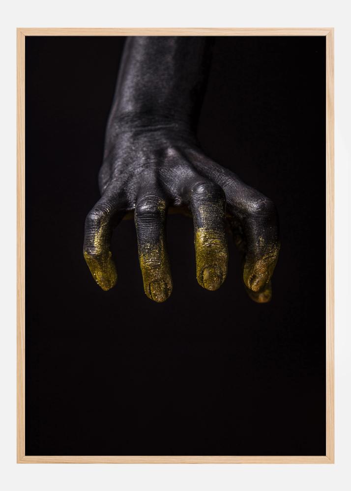 Ein dramatisches Poster mit einer krallenartigen Hand, die nach unten greift. Eine schwarze Hand kommt von oben in das Bild, die Finger sind gekrümmt, um nach etwas zu greifen. Die Fingerspitzen sind mit glitzerndem Gold überzogen und sorgen so für einen auffälligen Look. Holen Sie sich diesen epischen Druck nach Hause.