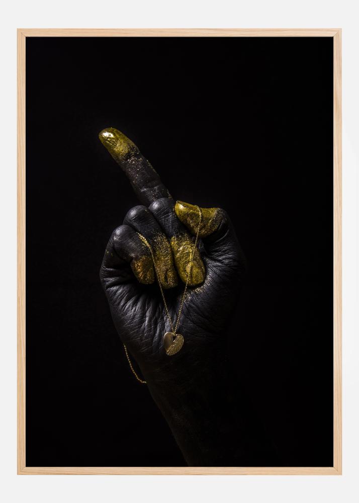 Ein dramatisches Poster einer schwarzen Hand mit goldenen Fingern, die nach links zeigen. Die geschlossene Faust zeigt mit dem Zeigefinger auf etwas Unsichtbares. Die Hand wird von einem goldenen Medaillon umgeben, das elegant über die goldenen Finger fällt. Kombinieren Sie dies mit einer weißen oder cremefarbenen Wand für einen starken Look.