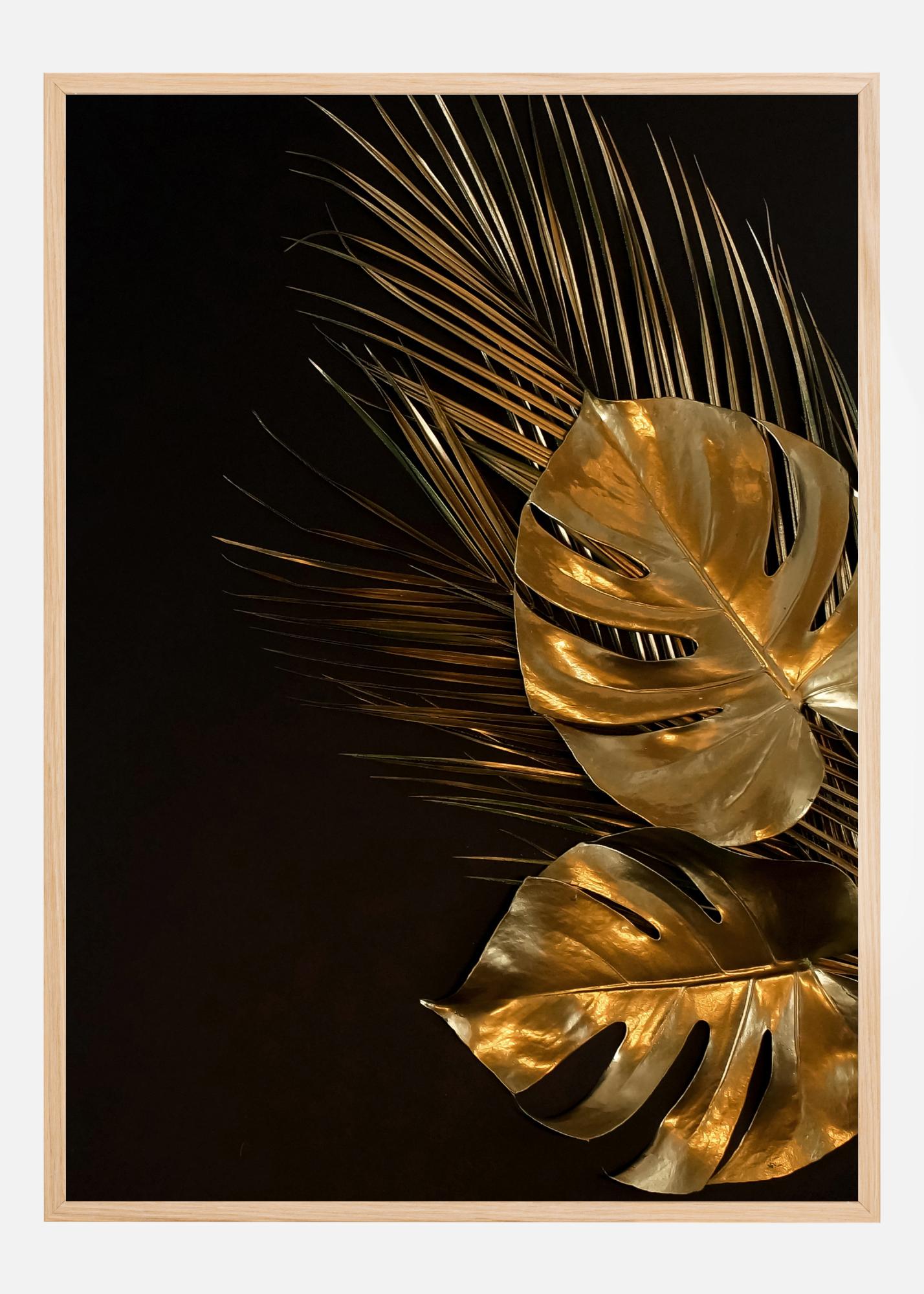 Ein natürliches Poster mit hellen goldenen Blättern vor schwarzem Hintergrund. Goldene Käsepflanzenblätter und goldfarbene Wedel füllen dieses atemberaubende Bild. Der Glanz des Goldes erzeugt ein Leuchten, das trotz des schwarzen Hintergrunds den Raum erhellt und ihm eine elegante und irgendwie festliche Atmosphäre verleiht.