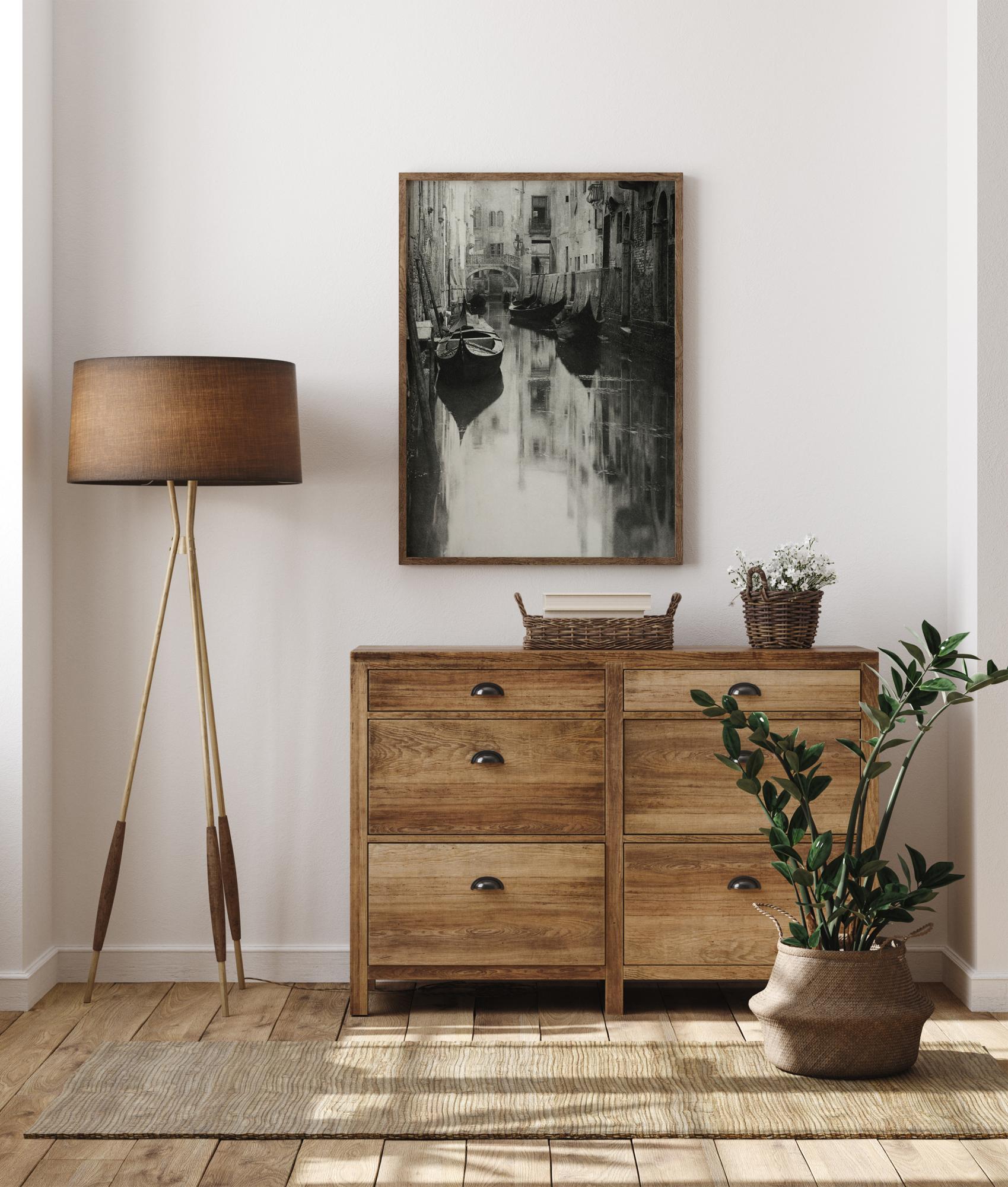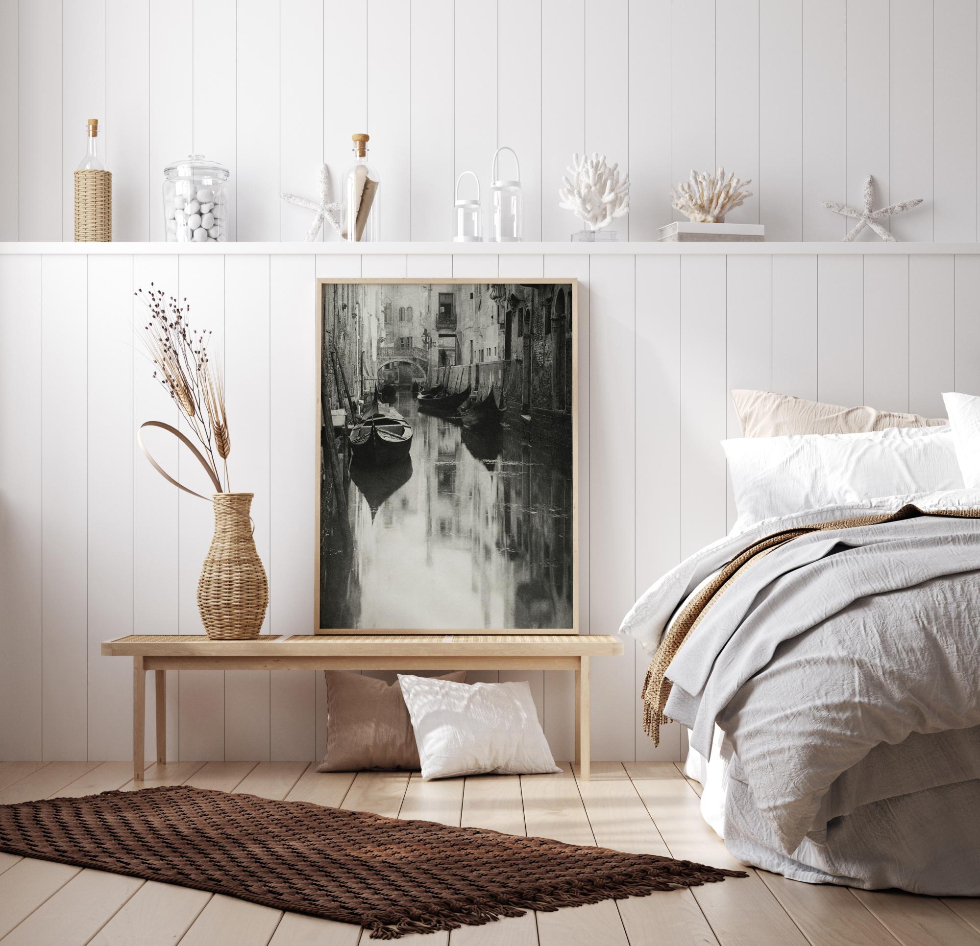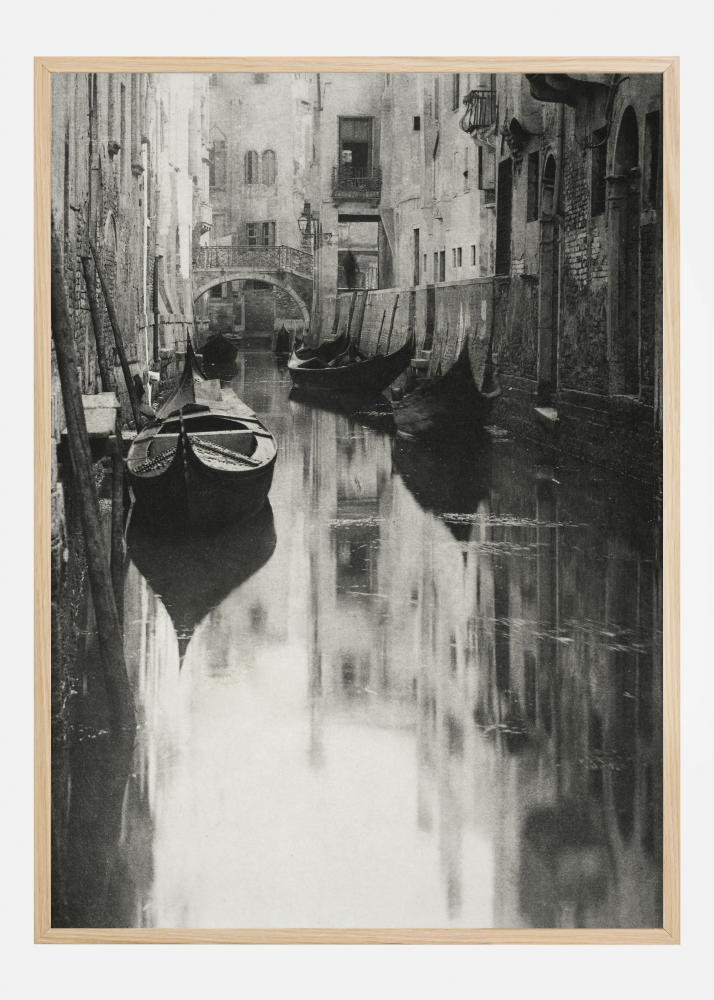 Ein Schwarz-Weiß-Poster von Gondeln, die in einem Kanal in Venedig vertäut sind. Die Boote liegen still auf dem ruhigen Wasser neben den steilen Häuserseiten. Das Foto strahlt Frieden und Ruhe in dieser abgelegenen Ecke der Stadt aus.