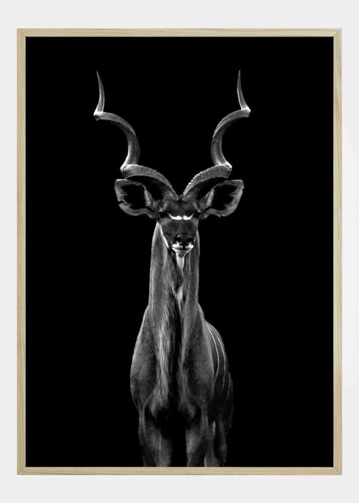 Ein Wildtierposter, das einen großen Kudu zeigt, der sich von einem schwarzen Hintergrund abhebt. Diese majestätische Antilope blickt in die Kamera, wobei die gewundenen Hörner spiralförmig nach oben ragen und das Bild ausfüllen. Holen Sie sich dieses atemberaubende schwarz-weiße Tierporträt in Ihr Zuhause und verleihen Sie ihm einen Hauch von Pracht.