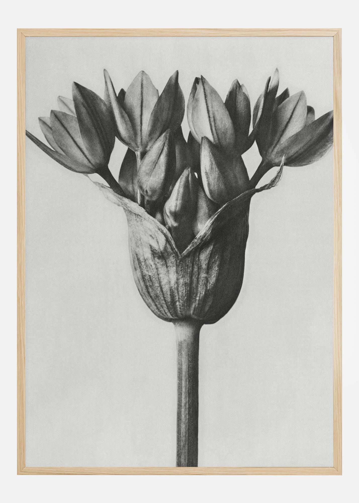 Ein wunderschönes Schwarz-Weiß-Bild einer Blume, aus der viele kleinere Blüten hervorgehen. Es stellt mit seiner Eleganz und Schlichtheit ein Symbol des Glücks dar. Die Licht- und Schatteneffekte erzeugen einen schönen Druck auf einem einfachen grauen Hintergrund. Ein passender Druck für eine geräumige Umgebung wie das Wohnzimmer oder das Schlafzimmer.