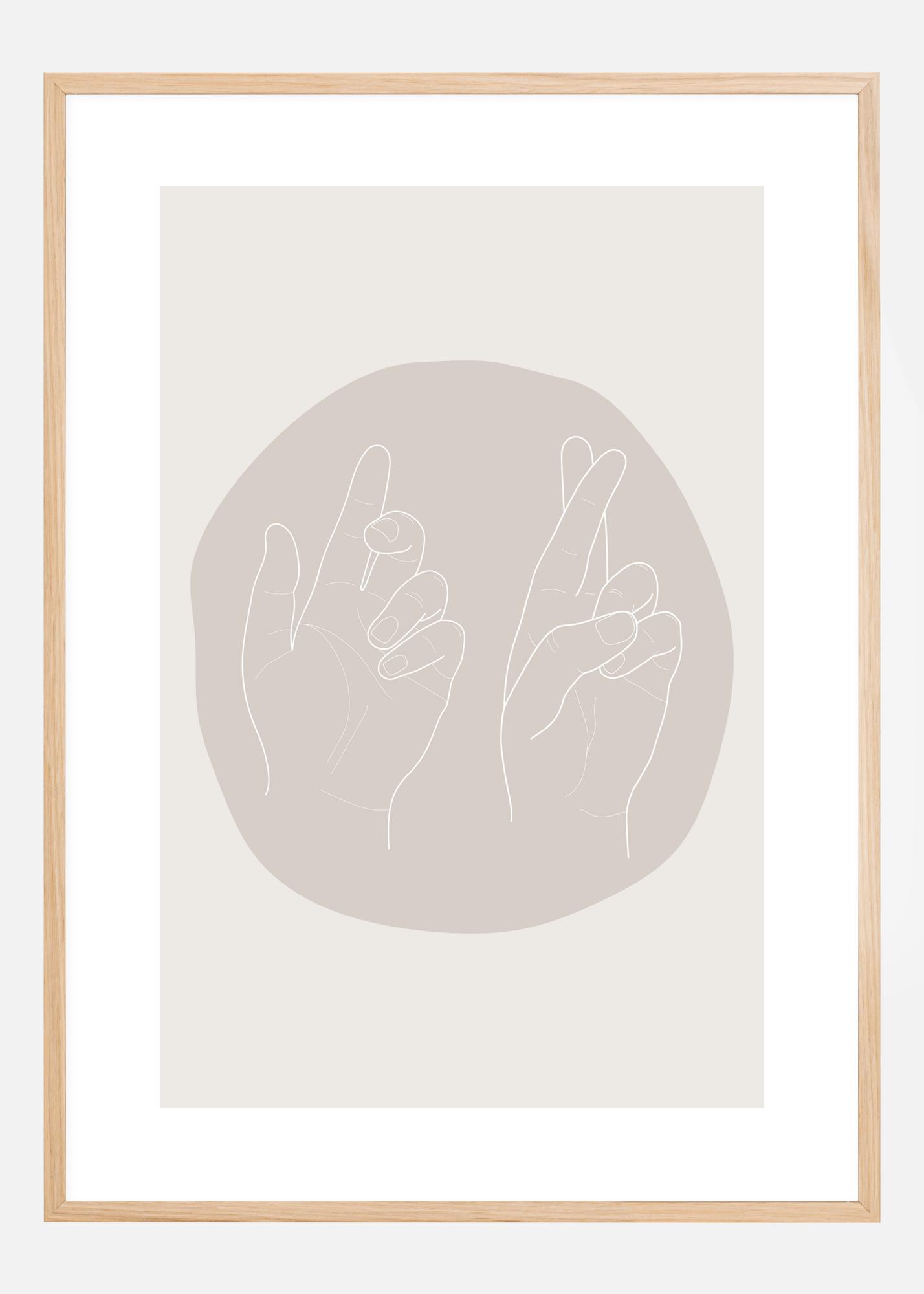 Ein einfacher Druck von zwei linken Händen auf einem beigefarbenen Kreis. Der Kreis ist auf einen nudefarbenen Hintergrund montiert, wobei beide Hände nach oben zeigen. Die Hände sind entspannt und schaffen ein ruhiges Ambiente für Ihr Zuhause. Der perfekte Druck für Ihr Arbeitszimmer.