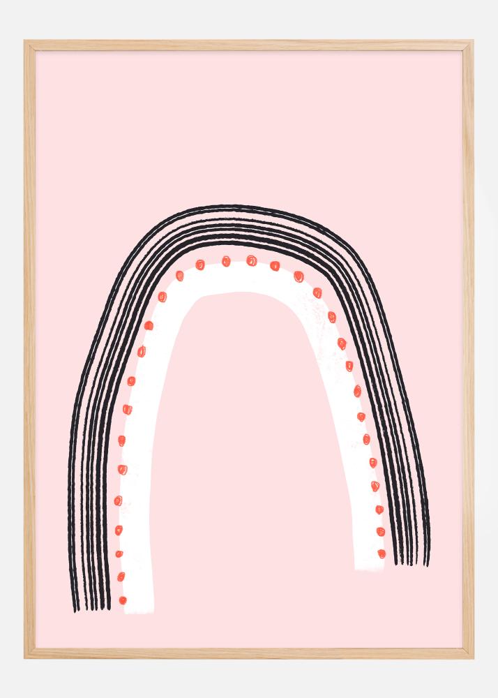 Dieses verspielte und charmante Poster zeigt einen stilisierten Regenbogen mit einem modernen und grafischen Ansatz. Vor einem hellrosa Hintergrund bilden die kräftigen, schwarzen Konturen der Regenbogenbögen einen markanten Kontrast, während Reihen kleiner, roter Herzen einer der Kurven folgen, was ein unwiderstehliches Gefühl von Freude und Positivität hinzufügt. Dieser Druck strahlt Einfachheit und Freude aus und könnte mit seinem Charme und freundlichen Erscheinungsbild jeden Raum erhellen.