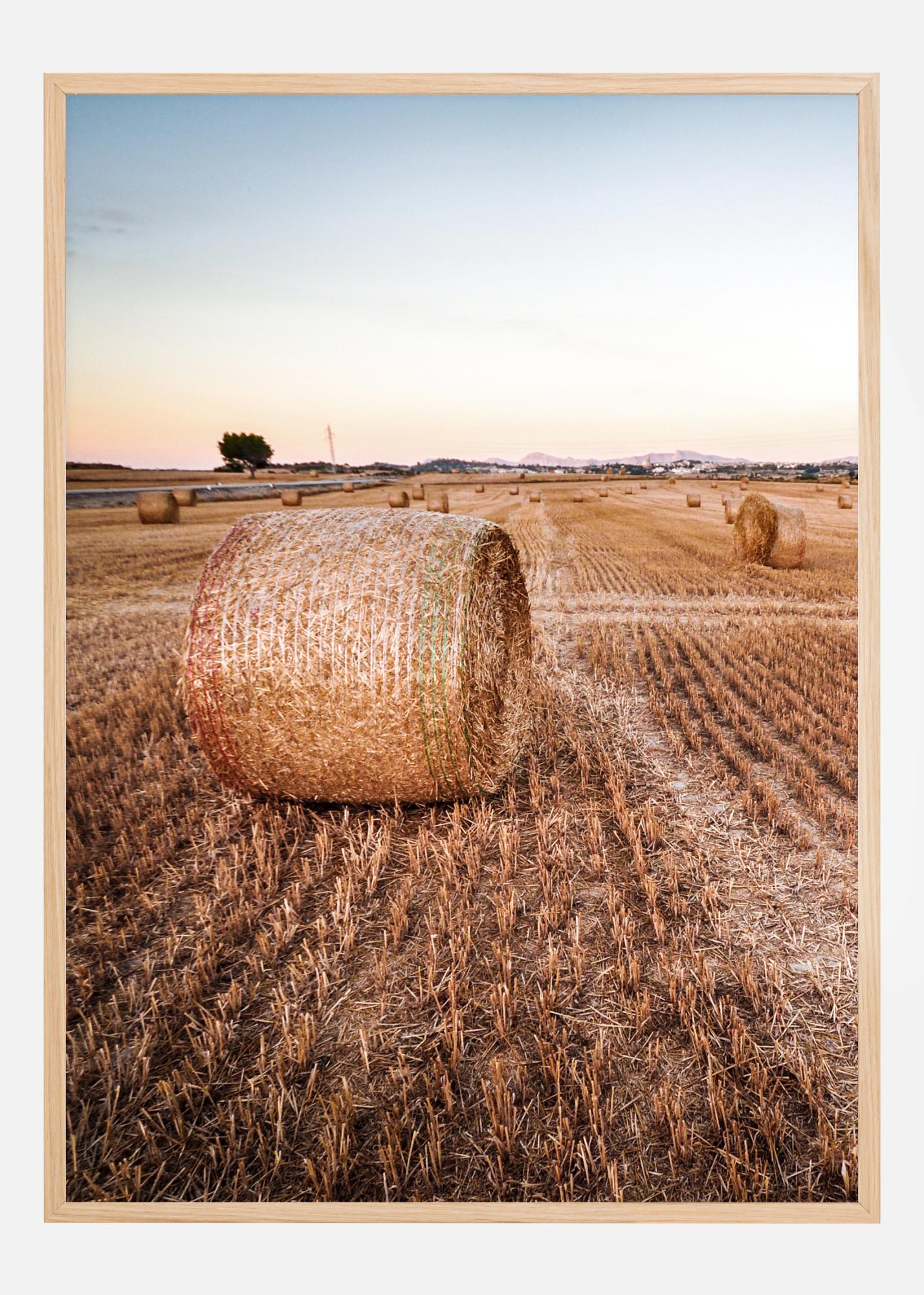 Ein einfaches, aber schönes Naturbild. Der Heuhaufen im Vordergrund ist sauber aufgerollt und bereit für die Ernte, während in der Ferne weitere aufgerollte Heuhaufen auf den Feldern verstreut sind. Der blassblaue Himmel und die warmen Brauntöne schaffen ein warmes, entspannendes Bild, das in einer Landhausküche hängen sollte.