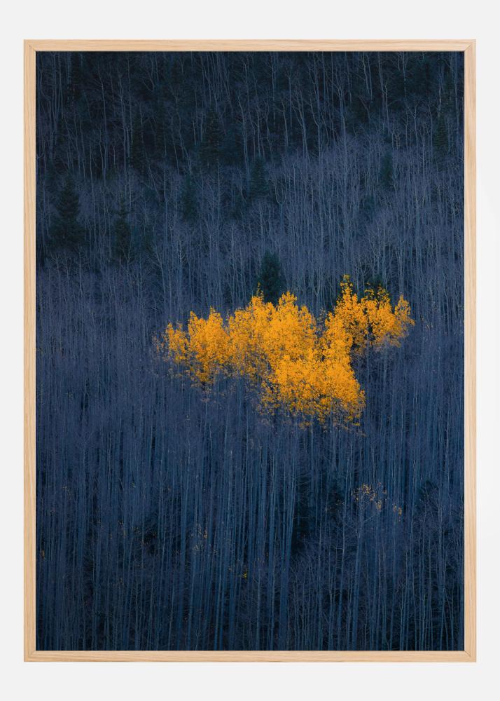 Ein atemberaubender Druck, der einen dunkelgrünen und mitternachtsblauen Wald darstellt. In der Mitte des Bildes sind die Baumspitzen gelb hervorgehoben, was dem Bild ein wenig Farbe verleiht. Ein schöner Druck, der in einem Wohnzimmer eine entspannende Atmosphäre schafft.