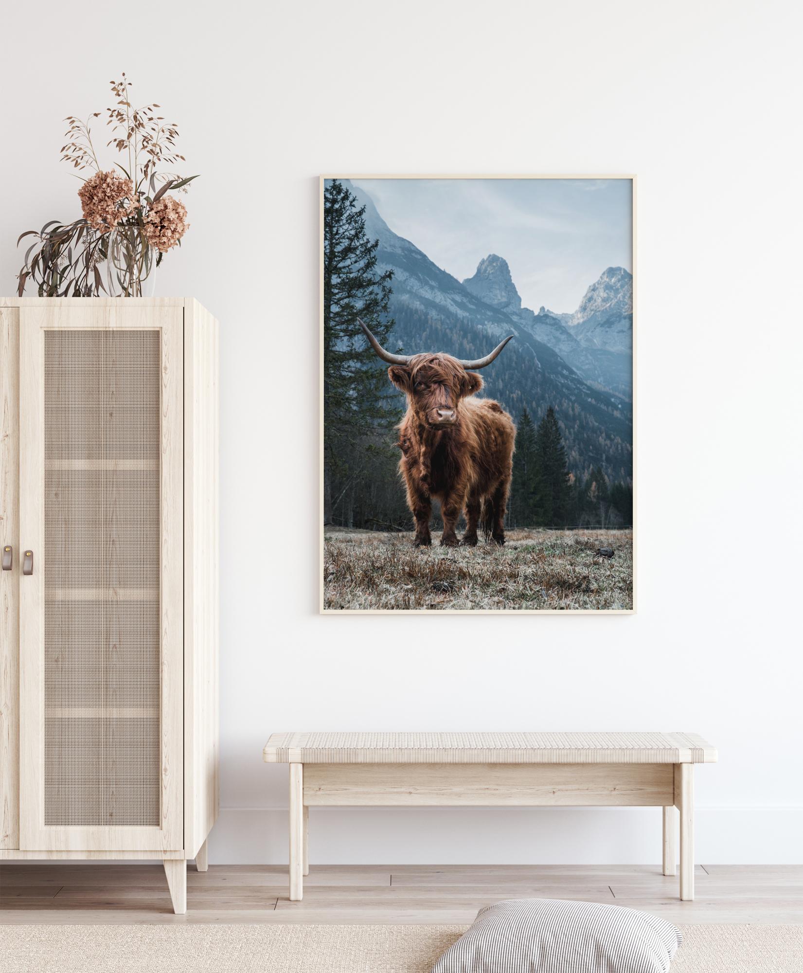 Ein wildes Poster einer roten Hochlandkuh, die allein auf einem Feld steht. Die steilen, schneebedeckten Berge umgeben dieses schöne Tier. Mit seinem kurzen, zotteligen Fell, das den unwirtlichen Bedingungen standhält, scheint es sich durch nichts stören zu lassen. Lassen Sie Ihrer Fantasie freien Lauf und stellen Sie sich vor, Sie wären in den schottischen Mooren.