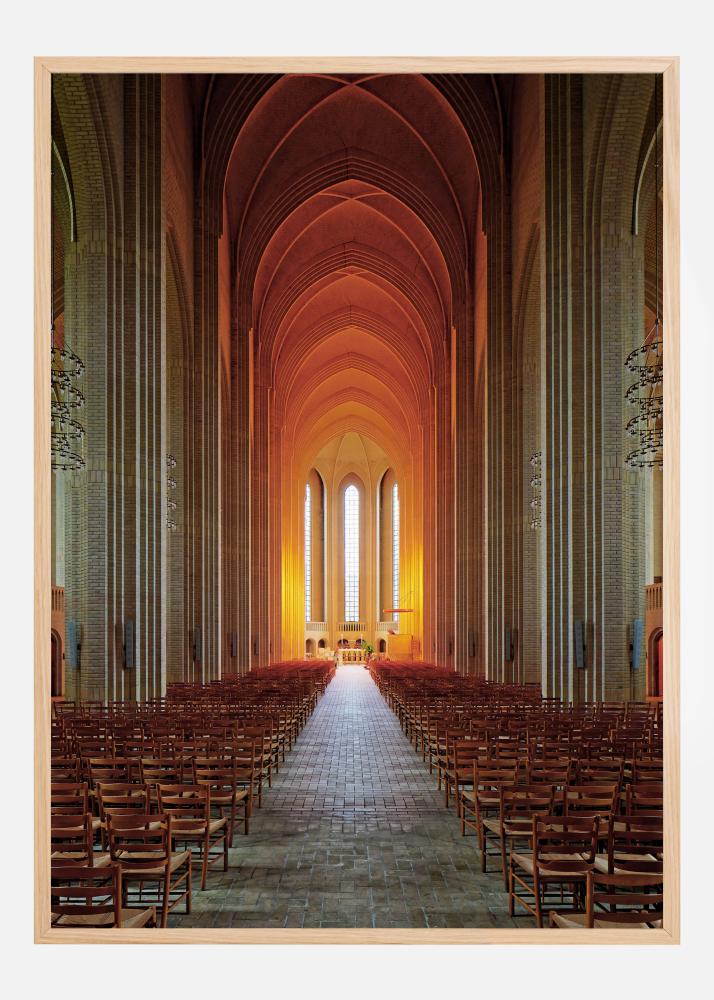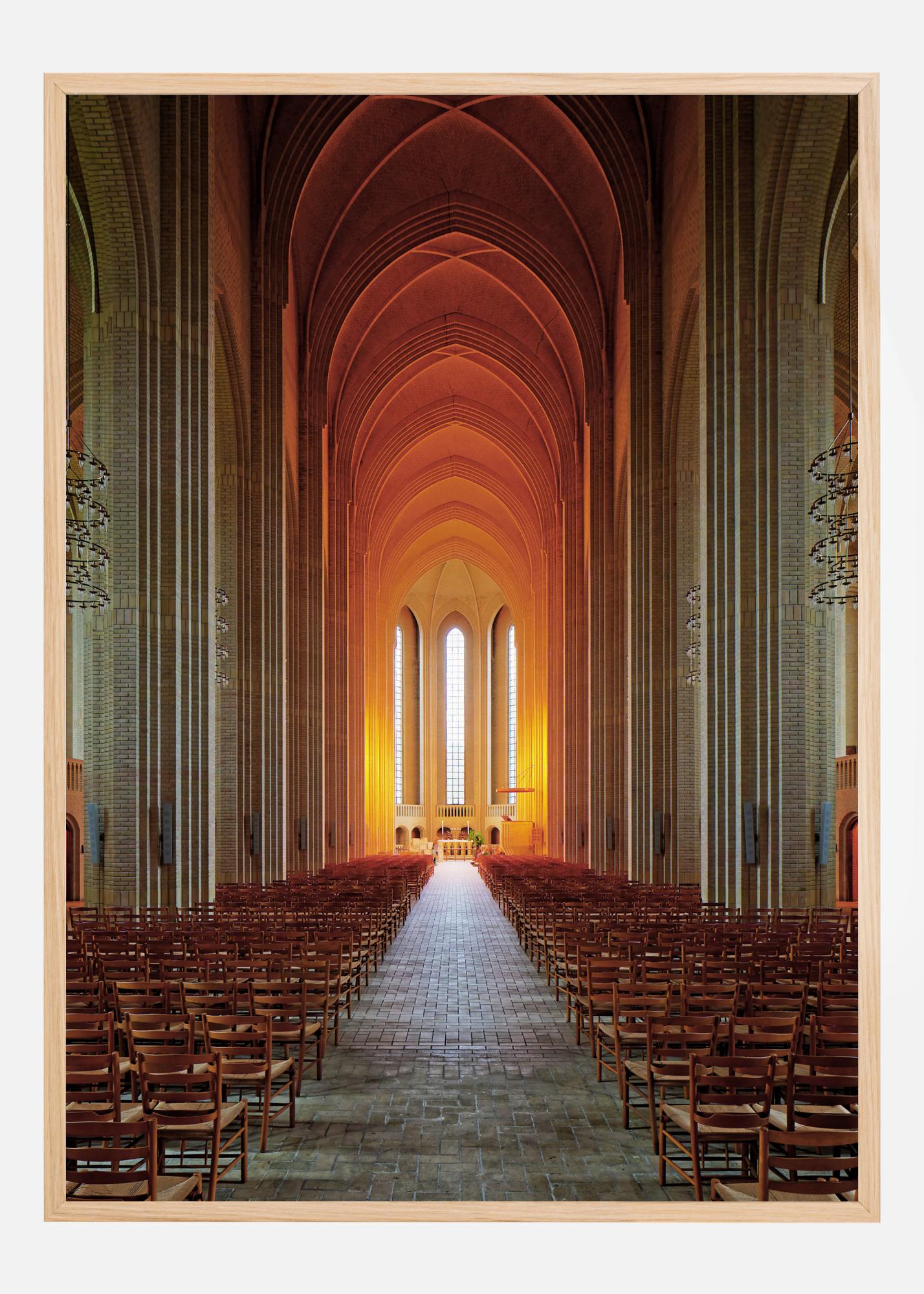 Ein atemberaubender architektonischer Druck im Inneren einer Kirche. Der lange Gang, der zum Altar führt, die hohe Decke und die Steinsäulen vermitteln ein sehr friedliches Gefühl. Das helle orangefarbene Licht, das durch die Fenster reflektiert wird, vermittelt ein Gefühl von Wärme und Harmonie. Spüren Sie den Frieden und die Ruhe in diesem Bild.