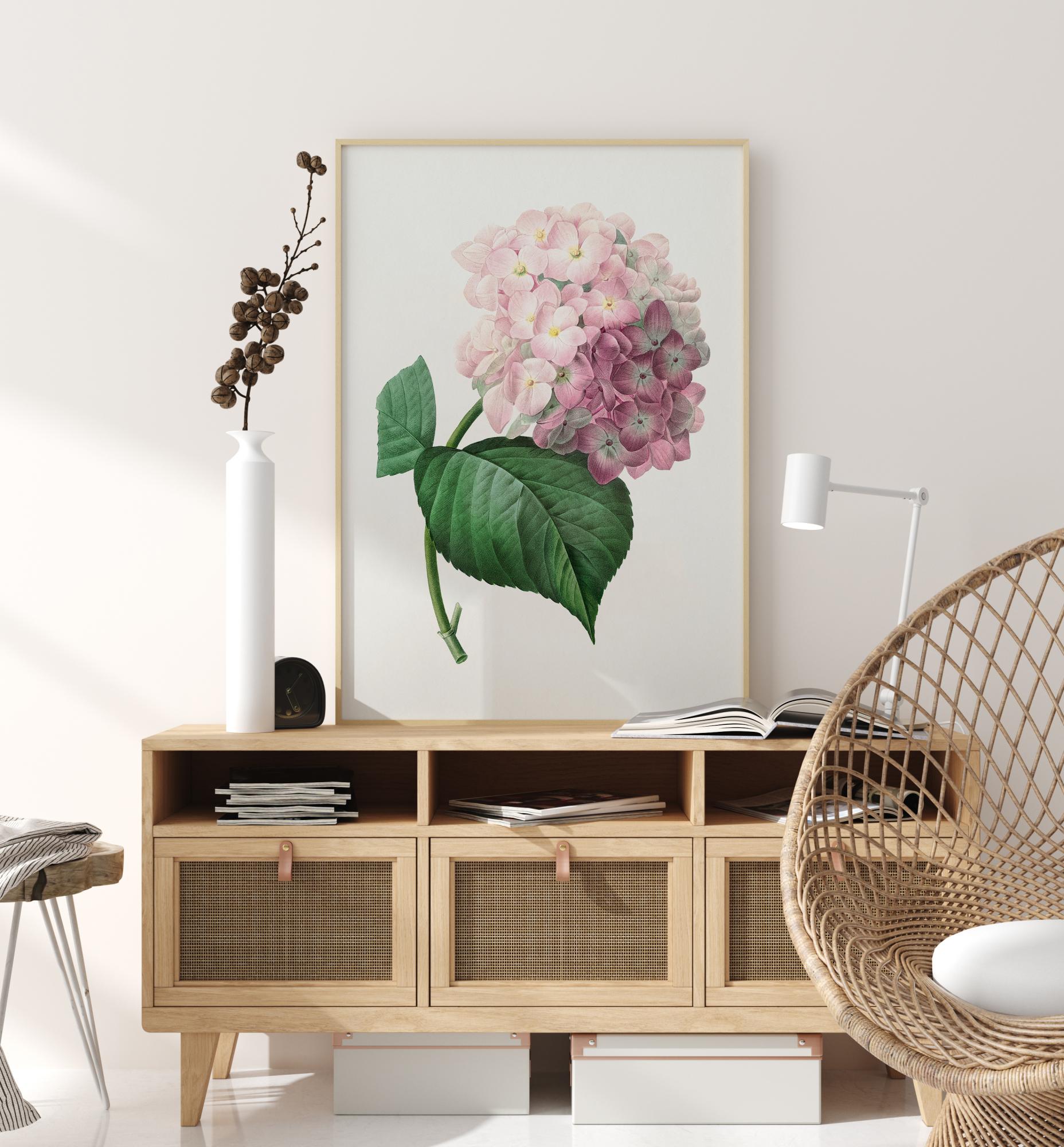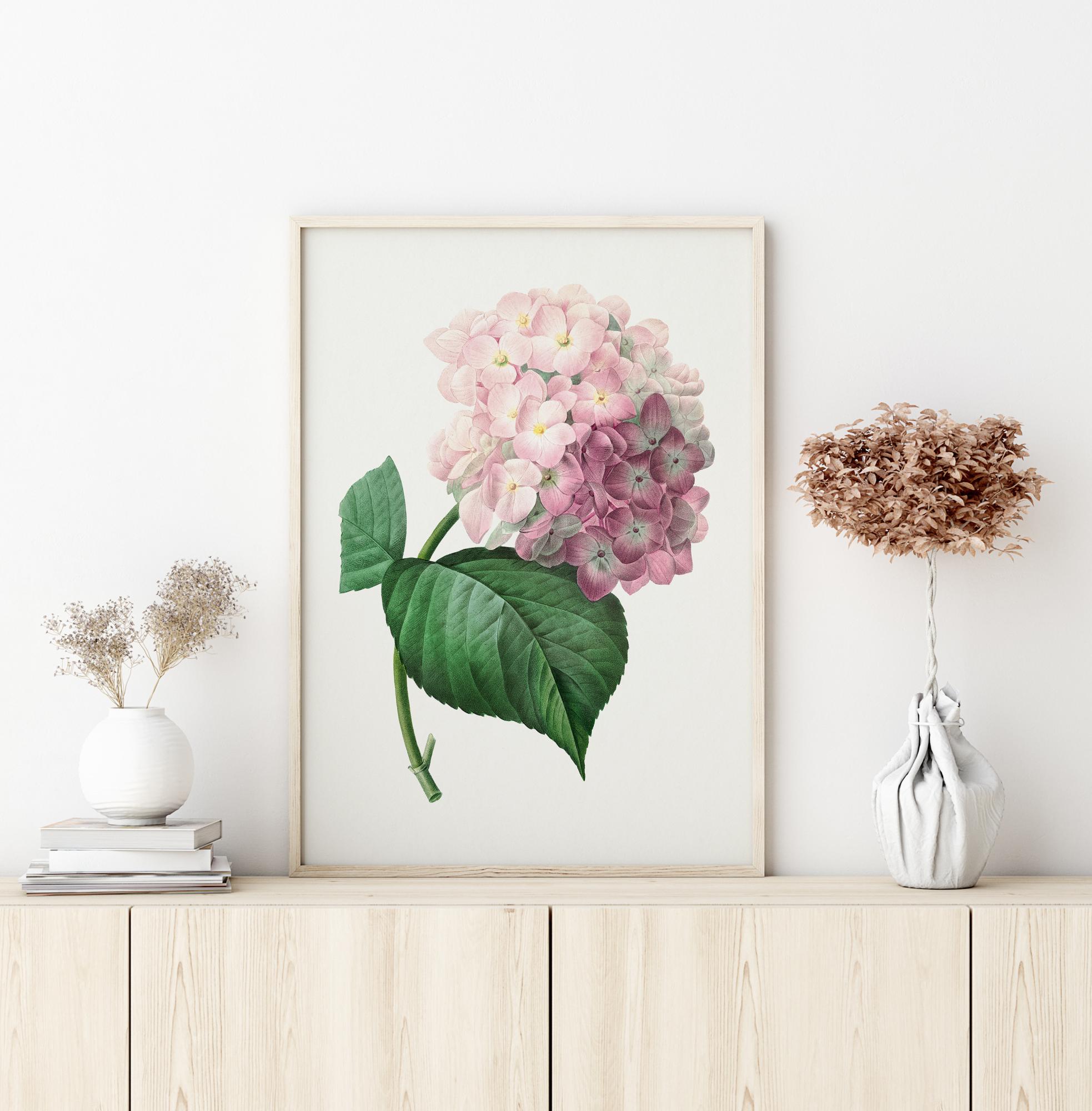Ein Blumendruck einer Hortensie. Zartrosafarbene Blütenblätter mit einem glatten grünen Stiel und einem grünen Blatt dominieren die Mitte des Bildes. Auf einem strahlend weißen Hintergrund vermittelt diese schöne, aber zarte Blume ein Gefühl von Ruhe und Gelassenheit. In Ihrem Wintergarten aufgehängt, wird es der Umgebung einen Hauch von Klasse verleihen.