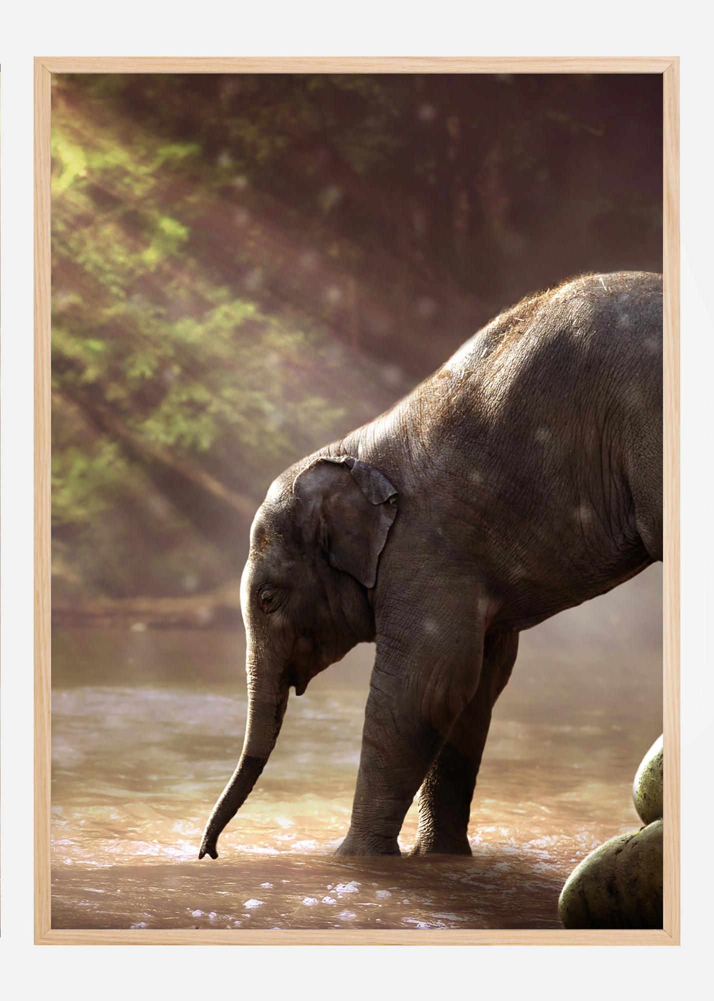 Ein süßes Foto eines Elefantenbabys, das von seiner Mutter ermutigt wird, in den Fluss zu gehen. Das Tageslicht scheint durch die Bäume und spiegelt sich auf dem Wasser, was ein Gefühl von Wärme erzeugt, während die Mutter zögert, ins Wasser zu gehen und ihr Baby sanft von den Felsen schiebt. Ein süßer Druck, der die intensive Liebe zwischen Mutter und Kind widerspiegelt.