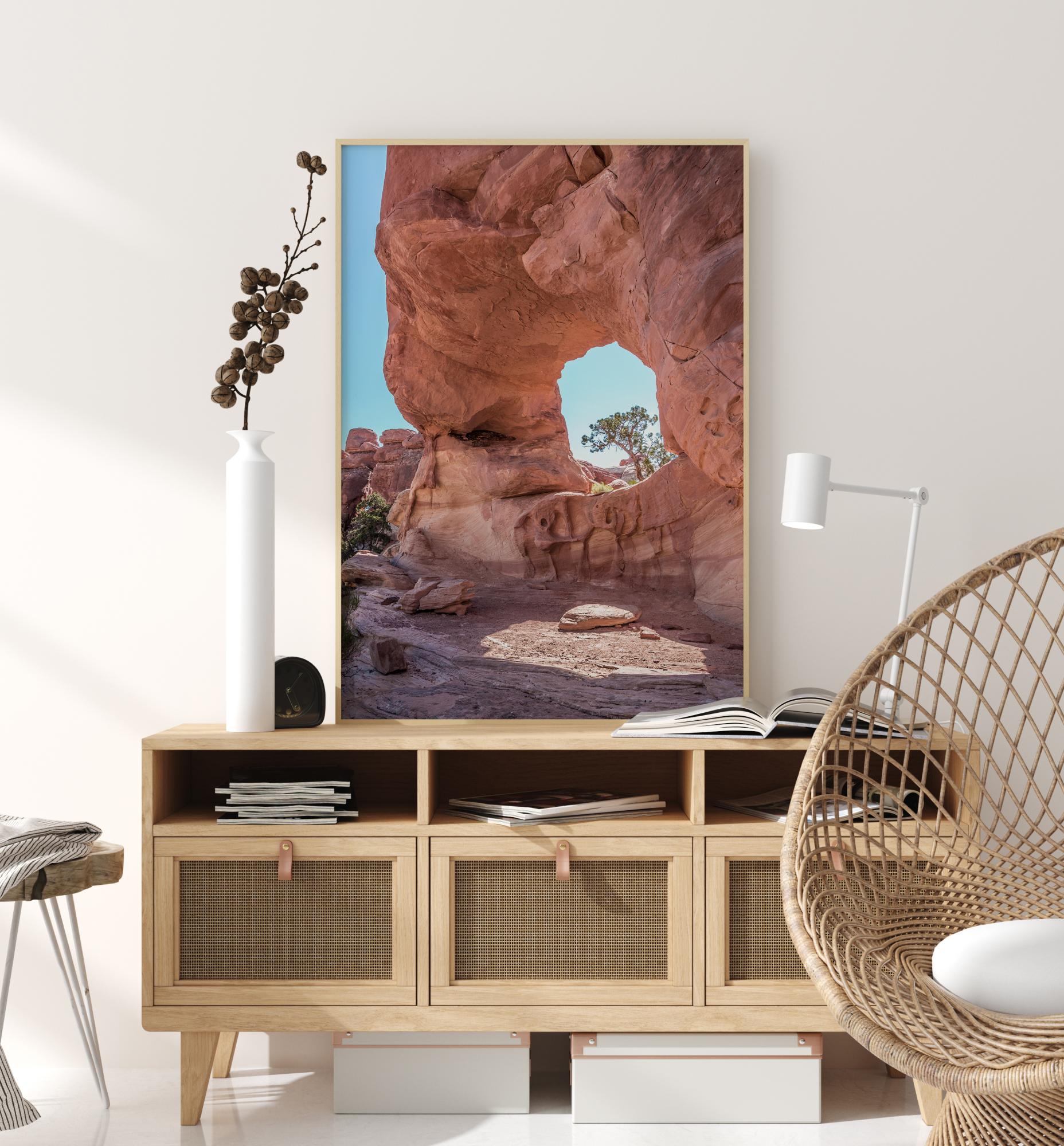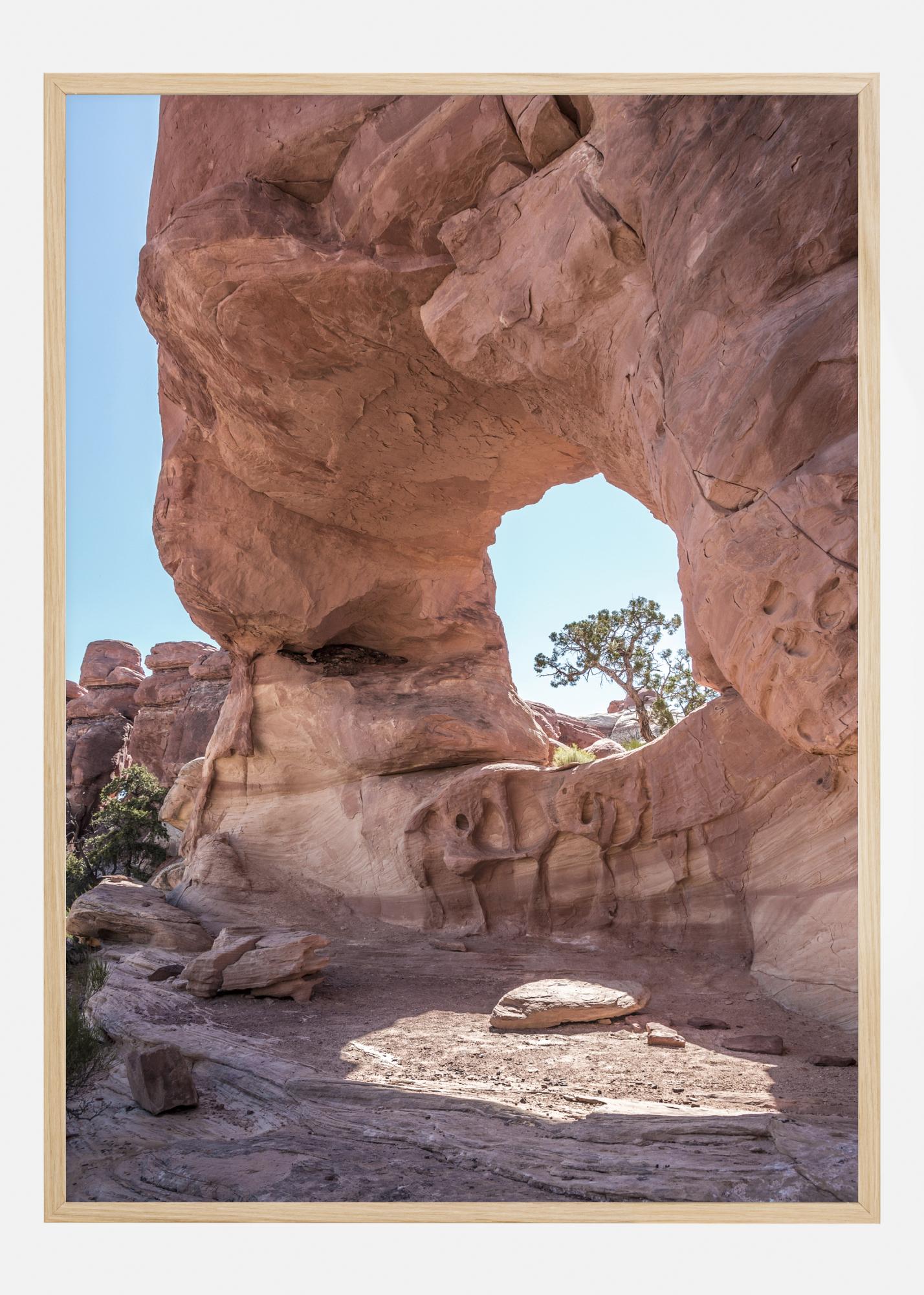 Ein imposantes Naturposter mit einem orangefarbenen Felsen, der in der Mitte ein Loch hat. Ein kleiner Baum erscheint auf der anderen Seite des Lochs. Die Sonne scheint durch das Loch im Felsen und erzeugt einen schattigen Bereich vor dem Felsen. Die schönen, kräftigen Farben sind perfekt, um einen tristen Raum aufzuhellen.