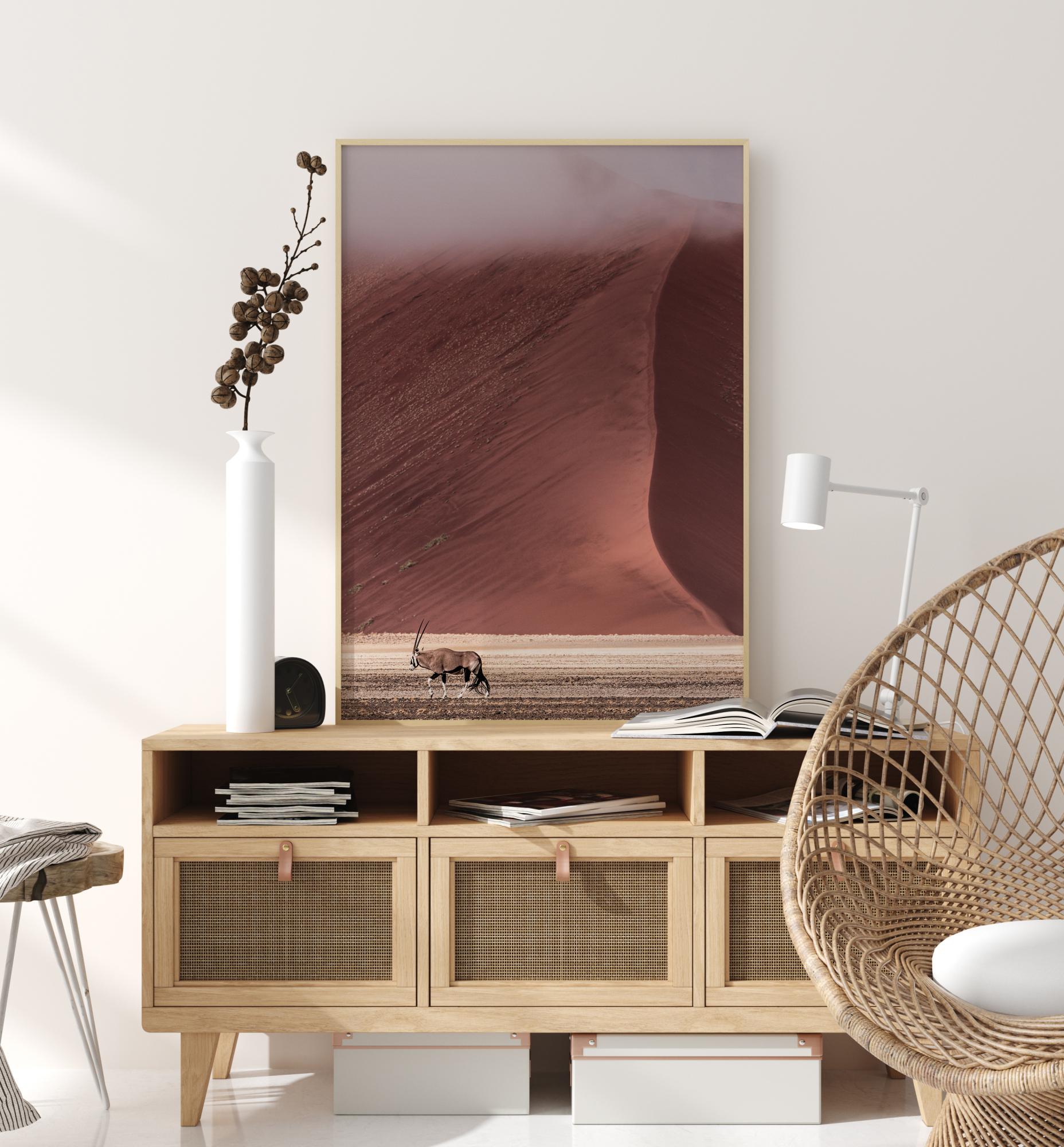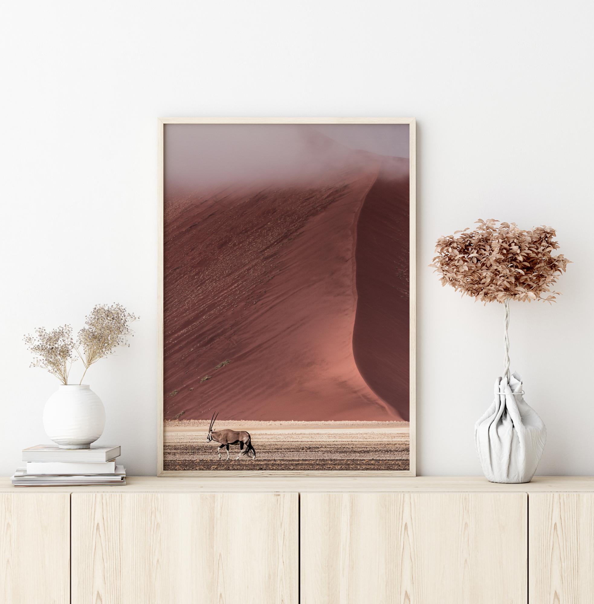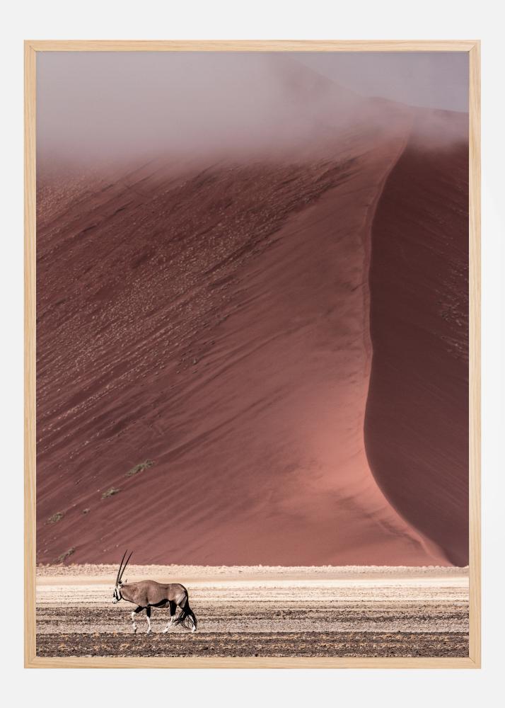 Ein einfaches Poster mit einer müden Gazelle, die die Wüste durchquert. Im Hintergrund trifft eine beeindruckende rote Düne auf den sandigen Boden am unteren Rand des Bildes. Die schönen Farben beginnen zu verblassen, wenn der Wüstennebel fällt. Auf einem cremefarbenen Hintergrund schaffen diese beruhigenden Farben eine wunderschöne Naturszene.