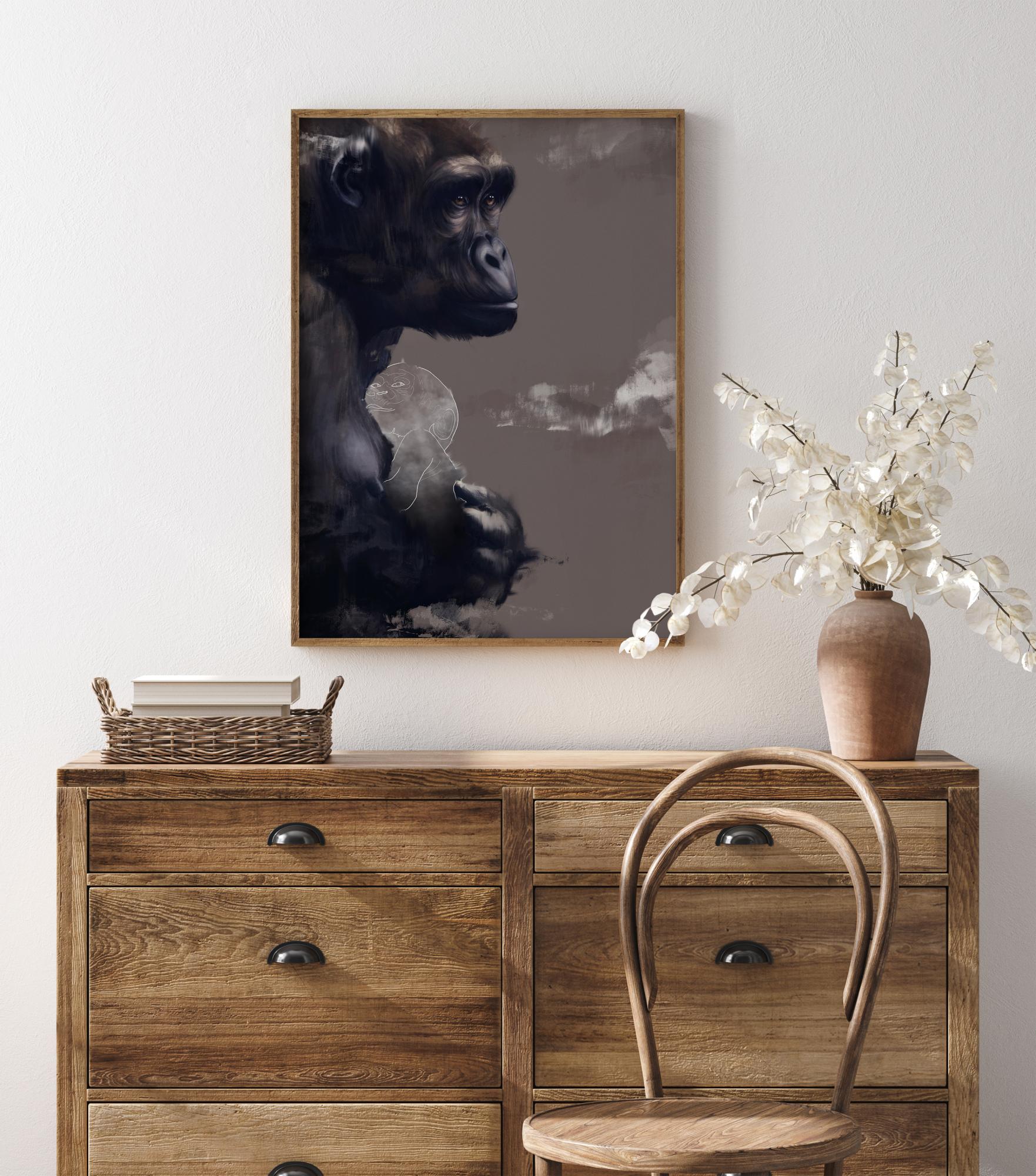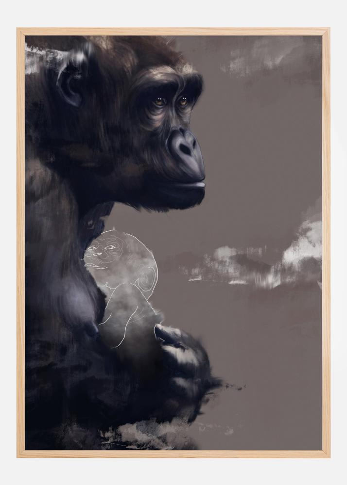Ein eindrucksvoller Naturdruck eines Gorillas, der sein neugeborenes Kind hält. Dieses stämmige Säugetier auf hellbraunem Hintergrund verkörpert einen starken und doch sanften Mutterinstinkt. Dieser unvollendete Druck eines Gorillas, der das Neugeborene in seinen liebevollen Armen beschützt, ist der ideale Druck für jeden Tierliebhaber.