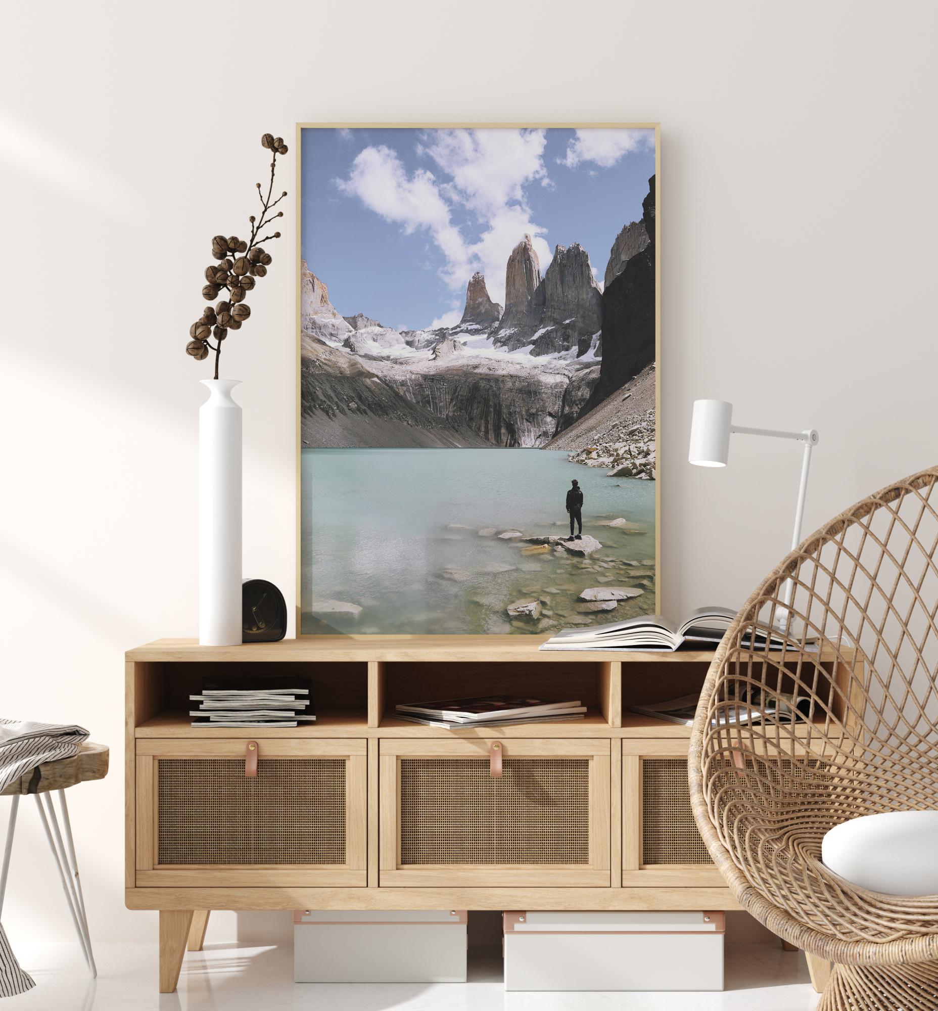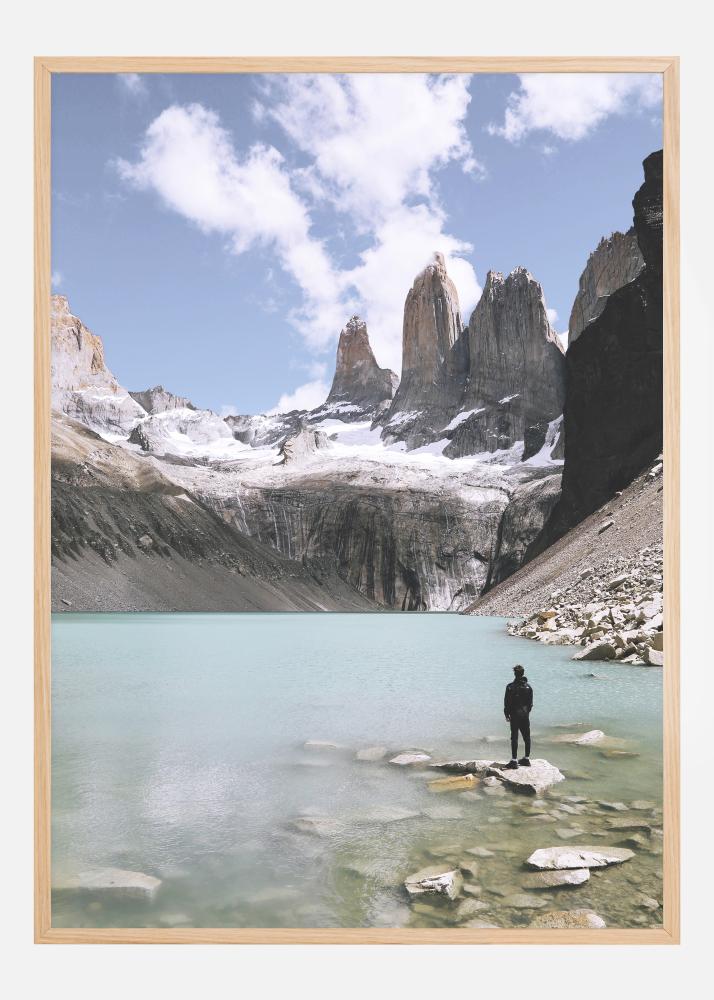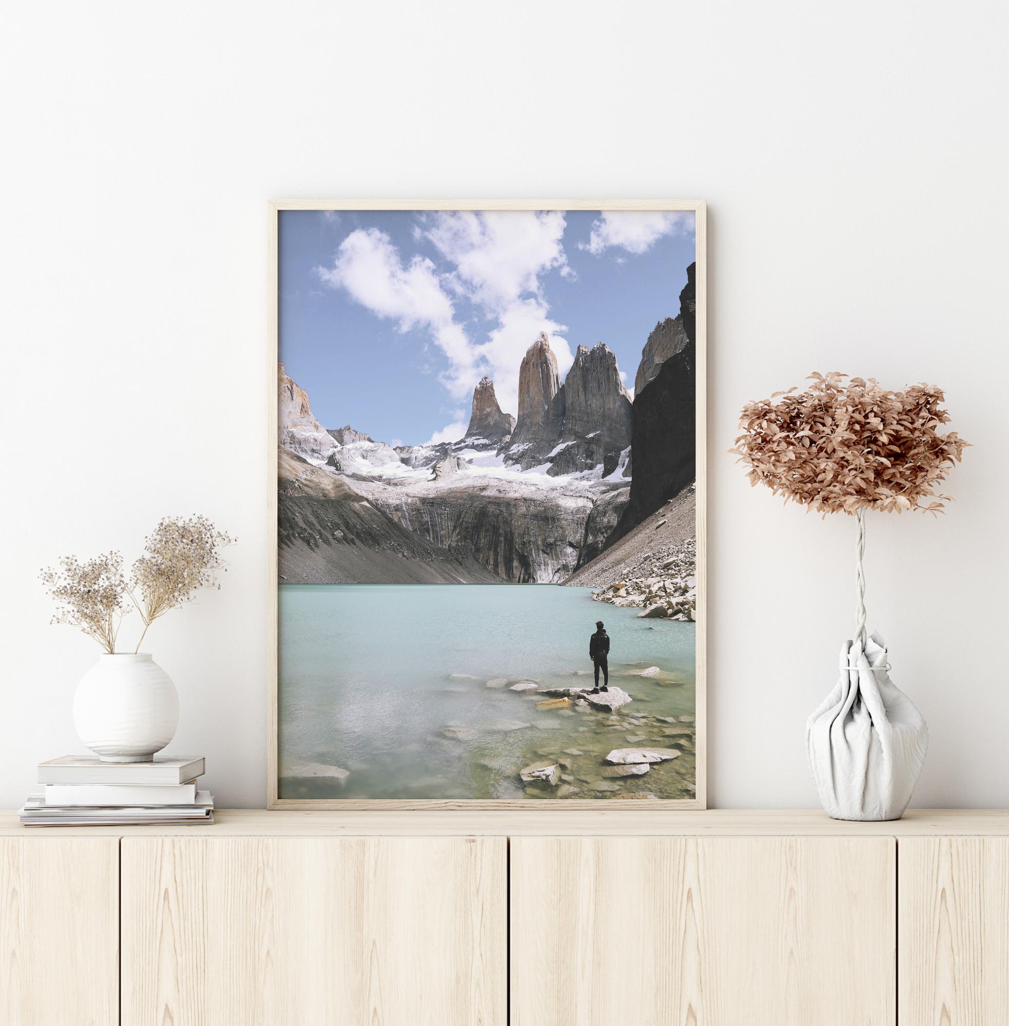 Ein Naturposter mit einer einsamen Figur, die die atemberaubende Umgebung beobachtet. Auf einem Stein am Seeufer stehend, umgeben die imposanten schneebedeckten Berge einen türkisfarbenen See. Man kann fast die kühle Luft spüren, die von diesem magischen Bild ausgeht.