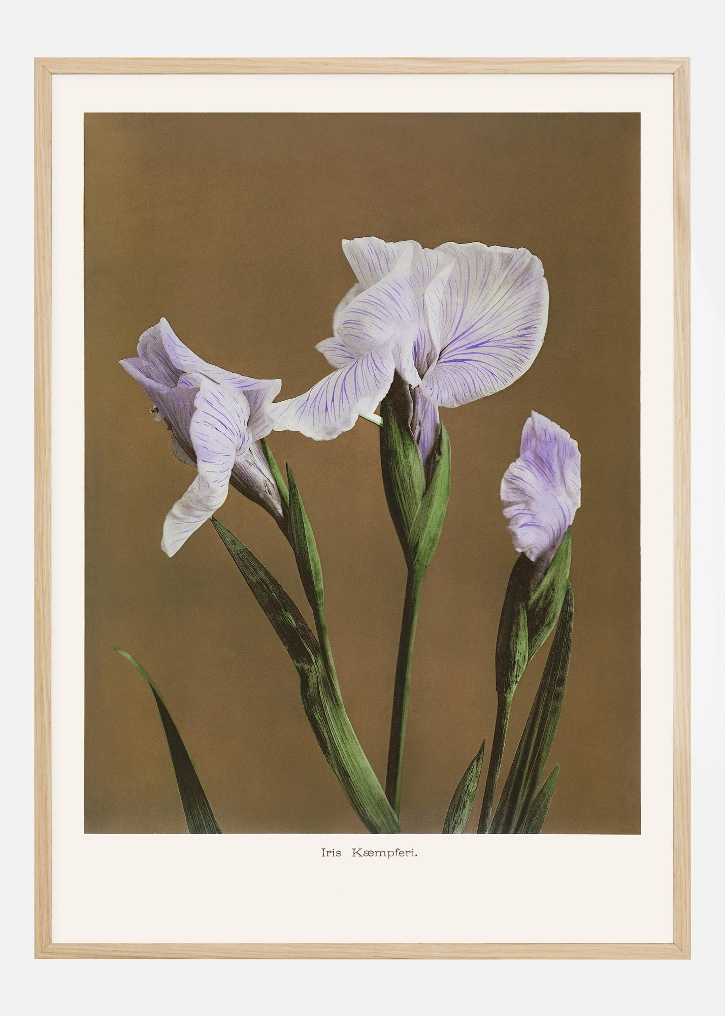 Dieses exquisite Poster zeigt die prächtige Iris Kaempferi, oft bekannt als japanische Schwertlilie, die stolz ihre markanten lila und weißen Blütenblätter zur Schau stellt. Die zarten Blüten in verschiedenen Lilatönen, von Pastell bis zu tieferen Nuancen von Violett, werden durch feine Linien und Muster ergänzt, die ein Gefühl von Finesse und Detailreichtum vermitteln. Vor dem einheitlichen kaffeefarbenen Hintergrund hebt sich die anmutige Form der Pflanze hervor, wodurch dieses Poster zu einem auffälligen Element in jedem Interieur-Design wird.