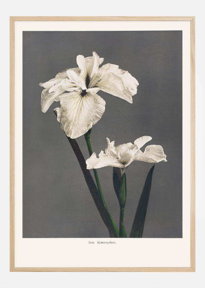 Dieser elegante Druck präsentiert Iris Kaempferi, auch bekannt als japanische Iris, in Schattierungen von blassem Gold und Weiß vor einem subtilen grauen Hintergrund, der die skulpturalen Qualitäten dieser bezaubernden Blumen hervorhebt. Die Details der Blumenstruktur sind fein mit Schatten und Licht betont, die über die Blütenblätter spielen, während dunkle, fast schwarze Streifen im Herzen der Blume Tiefe und Dimension hinzufügen. Eine harmonische Zusammenstellung von Farbe und Form, die die natürliche Schönheit dieser Blumen nachbildet.
