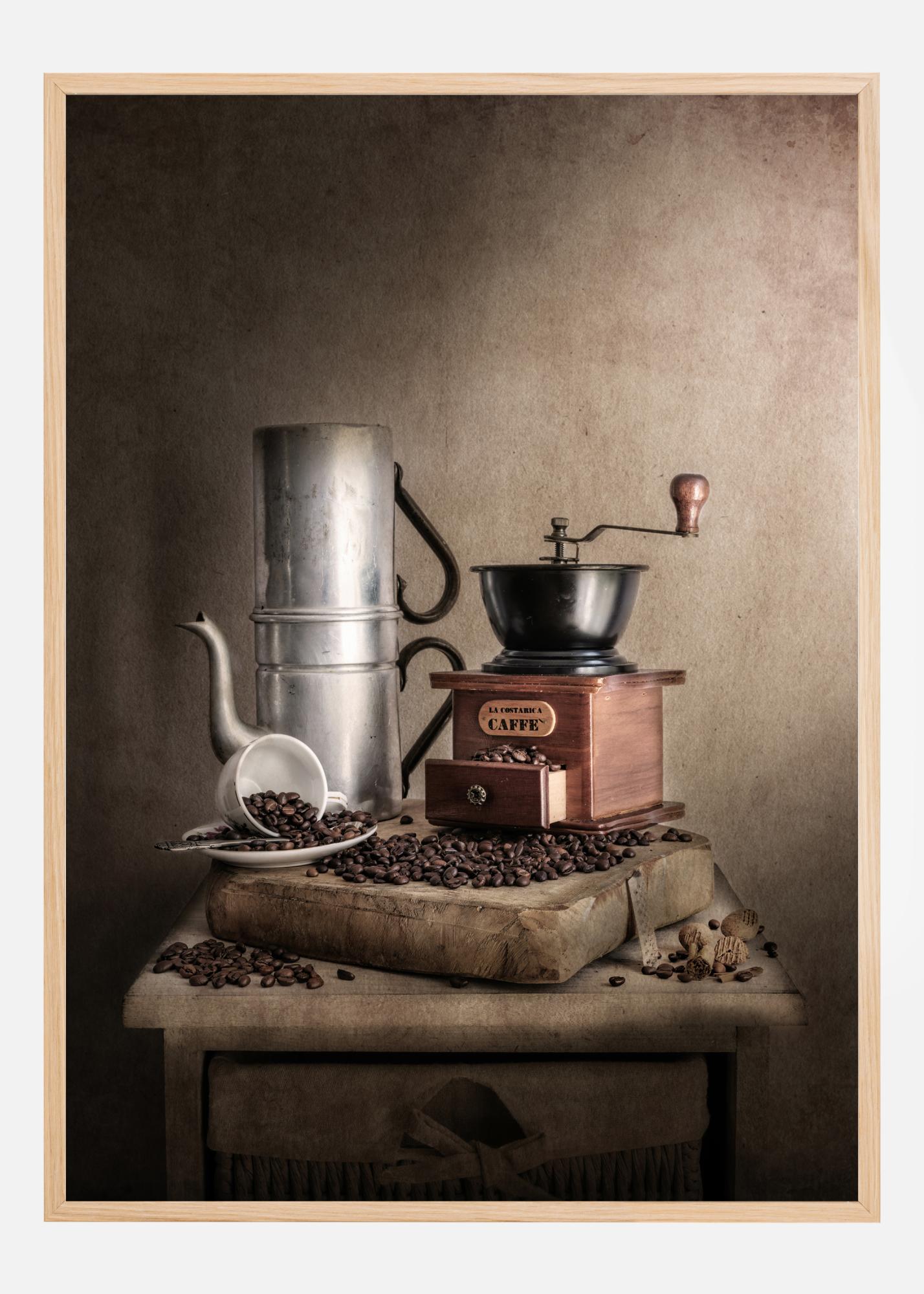 Ein Druck zum Thema Kaffee, der eine Kaffeemühle, eine Kaffeekanne, Kaffeebohnen und eine weiße Tasse mit Untertasse zeigt. Die sanften Brauntöne dieses Drucks schaffen ein entspannendes Bild, bei dem man die herrlich gerösteten Kaffeebohnen fast riechen kann. Das perfekte Bild zum Aufhängen in einer Küche.