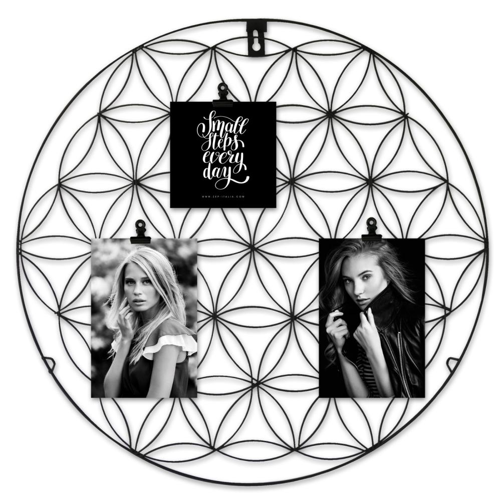 Ein moderner, runder Collage-Bilderrahmen aus schwarzem Metall. Der Collagerahmen misst 50 cm Ø im Durchmesser und die Bilder werden mit Hilfe der Klammern auf einem gemusterten Hintergrund befestigt. Da die Bilder mit Klammern aufgehängt werden, können beliebige Bildgrößen gewählt werden. Verschiedene Bildformate verleihen der Bildercollage mehr Dynamik. Dieser runde Collagebilderrahmen aus Metall macht an jeder Wand einen tollen Blickfang und eine stilvolle, persönliche Wanddekoration aus. Eignet sich auch wunderbar als persönliches Fotogeschenk.