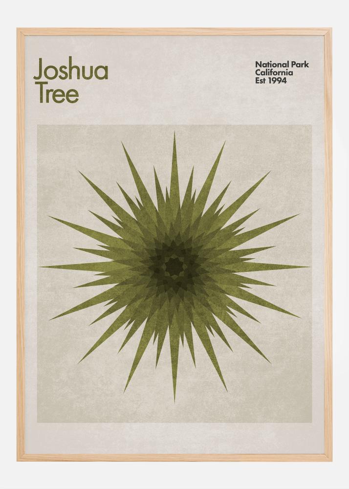 Dieses stimmungsvolle Poster stellt eine abstrakte Interpretation des ikonischen Joshua-Baums dar, zentriert und prominent in der Bildmitte. Die tiefe grüne Farbe des Motivs erinnert an die beruhigende Natur und die robuste Wüstenlandschaft, die die Heimat des Baums ist. Die Abstraktion des Baums, mit seinen ausgestreckten Spitzen, erzeugt ein fast hypnotisierendes Muster, das sowohl zeitgenössisch als auch zeitlos ist.