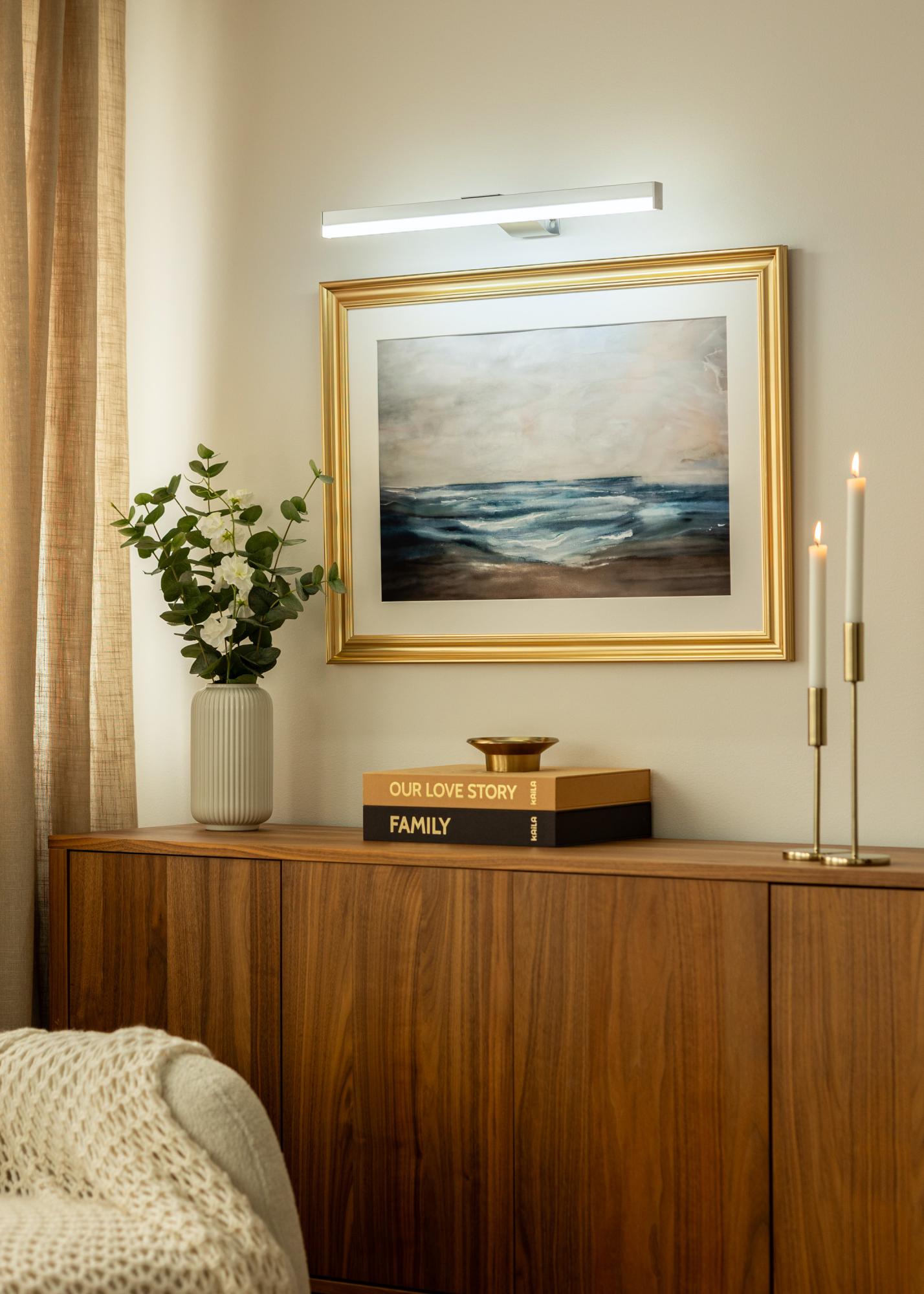 Diese batteriebetriebene Bilderbeleuchtung bietet eine praktische und flexible Lösung, um Ihre Kunstwerke zu beleuchten, ohne Kabel verlegen zu müssen. Dank des batteriebetriebenen Designs können Sie die Lampe überall platzieren, was es einfach macht, Ihrem Zuhause einen stilvollen und eleganten Lichtakzent zu verleihen, beispielsweise über einem Gemälde oder einer Fotografie. Mit einer Tiefe von 15 cm und einer Länge von 55 cm ist die Lampe perfekt geeignet, um eine gleichmäßige Beleuchtung für Bilder bis zu 80 cm Breite zu gewährleisten.