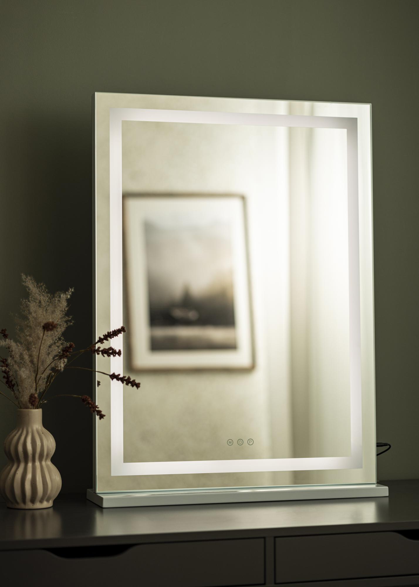 Dieser Make-Up Spiegel ist eine ausgesprochen gelungene Kombination aus minimalistischem und zugleich trendigem Design. Die klassische Form und das moderne, integrierte LED-Band, das wie ein Rahmen um die 80x60 cm große Spiegelfläche verläuft, verleihen dem Spiegel einen ansprechenden, eleganten Charakter. Der Spiegel ist mit einem Ständer ausgestattet, der abgenommen werden kann, wenn der Spiegel als Wandspiegel genutzt und an der Wand aufgehängt werden soll. So kann dieser funktionelle Lichtspiegel entweder auf einem Tisch, einer Kommode, einem Regal aufgestellt oder an der Wand befestigt werden. Der Spiegel wird im Hochformat, also hochkant aufgestellt bzw. befestigt.
