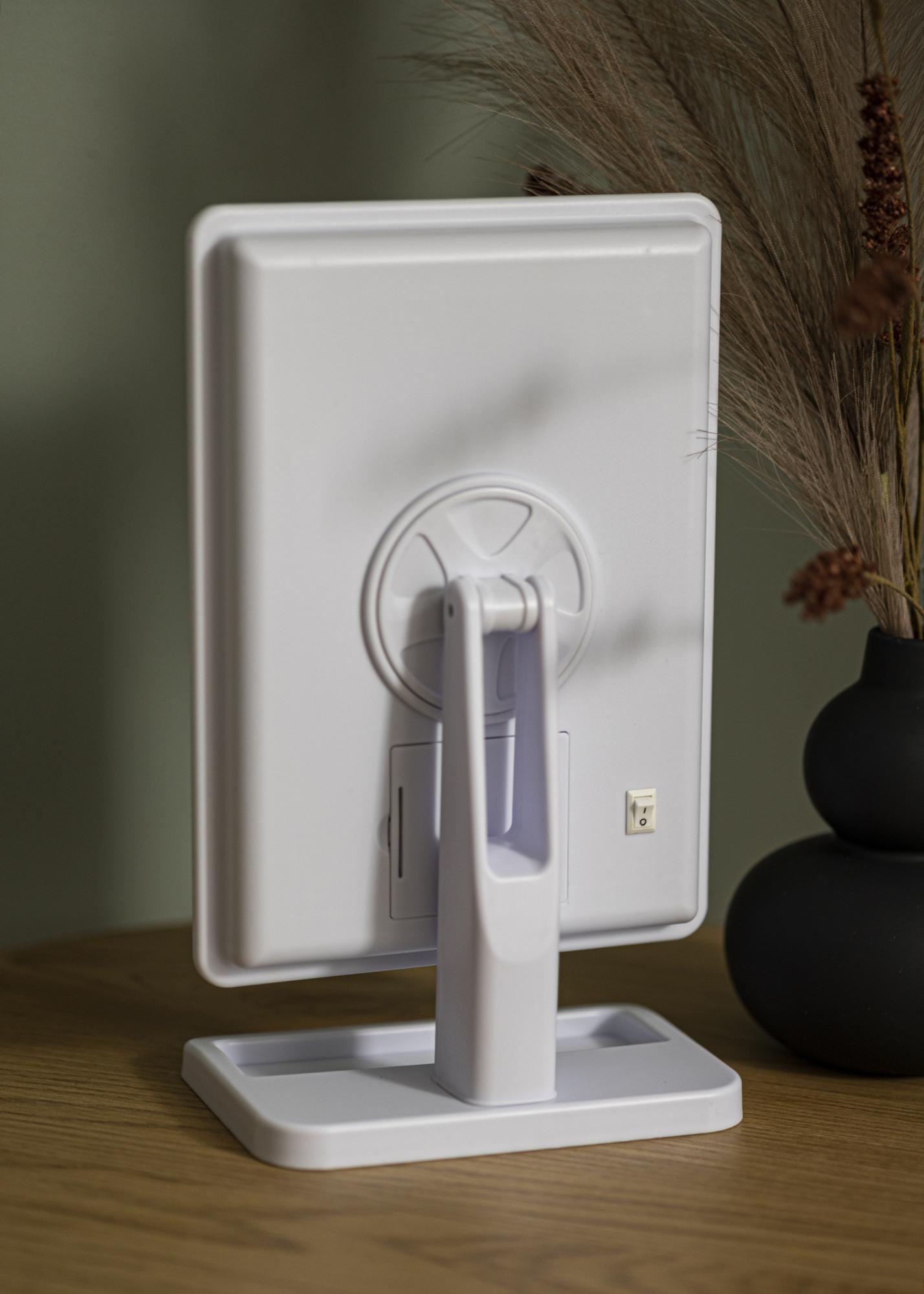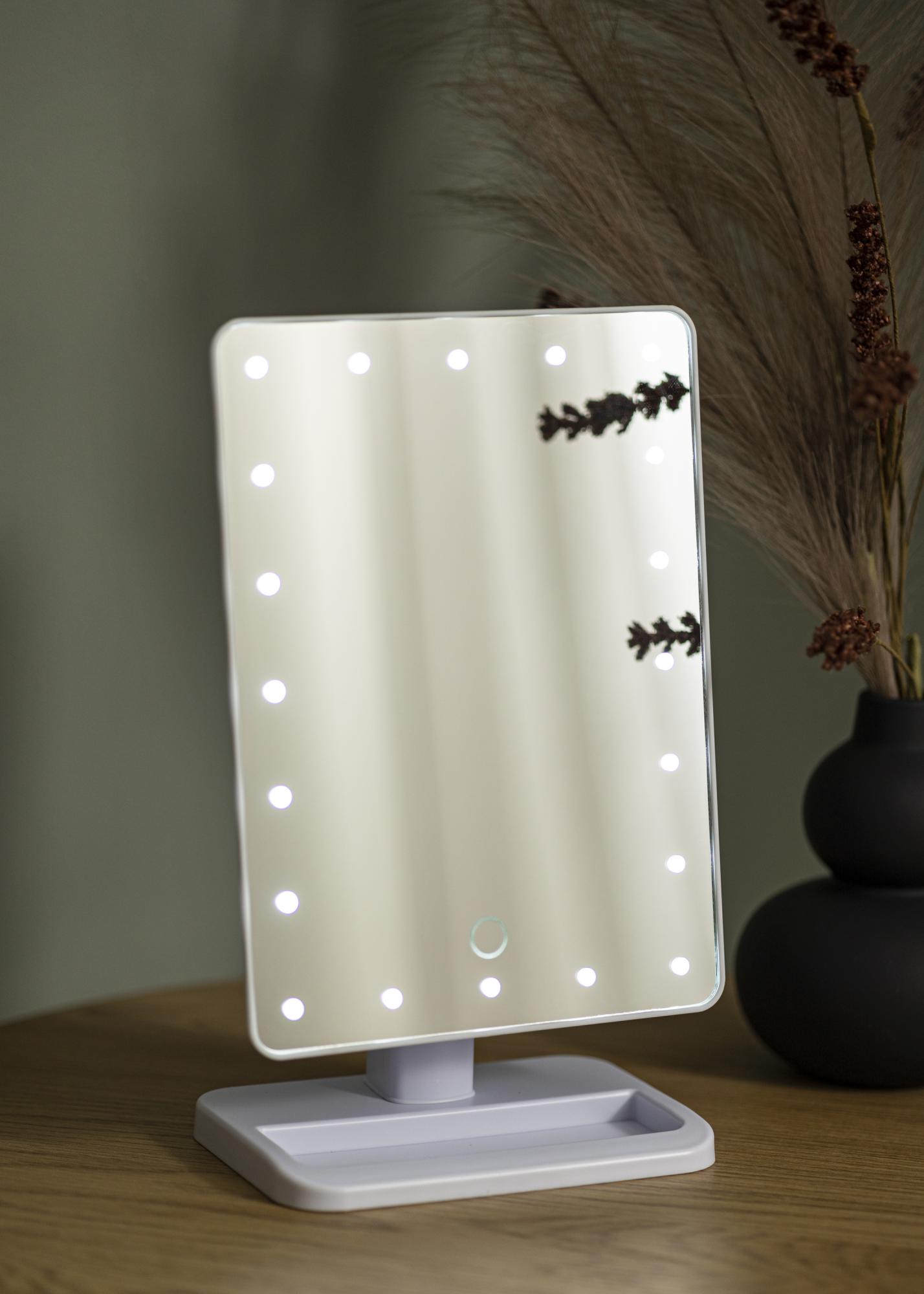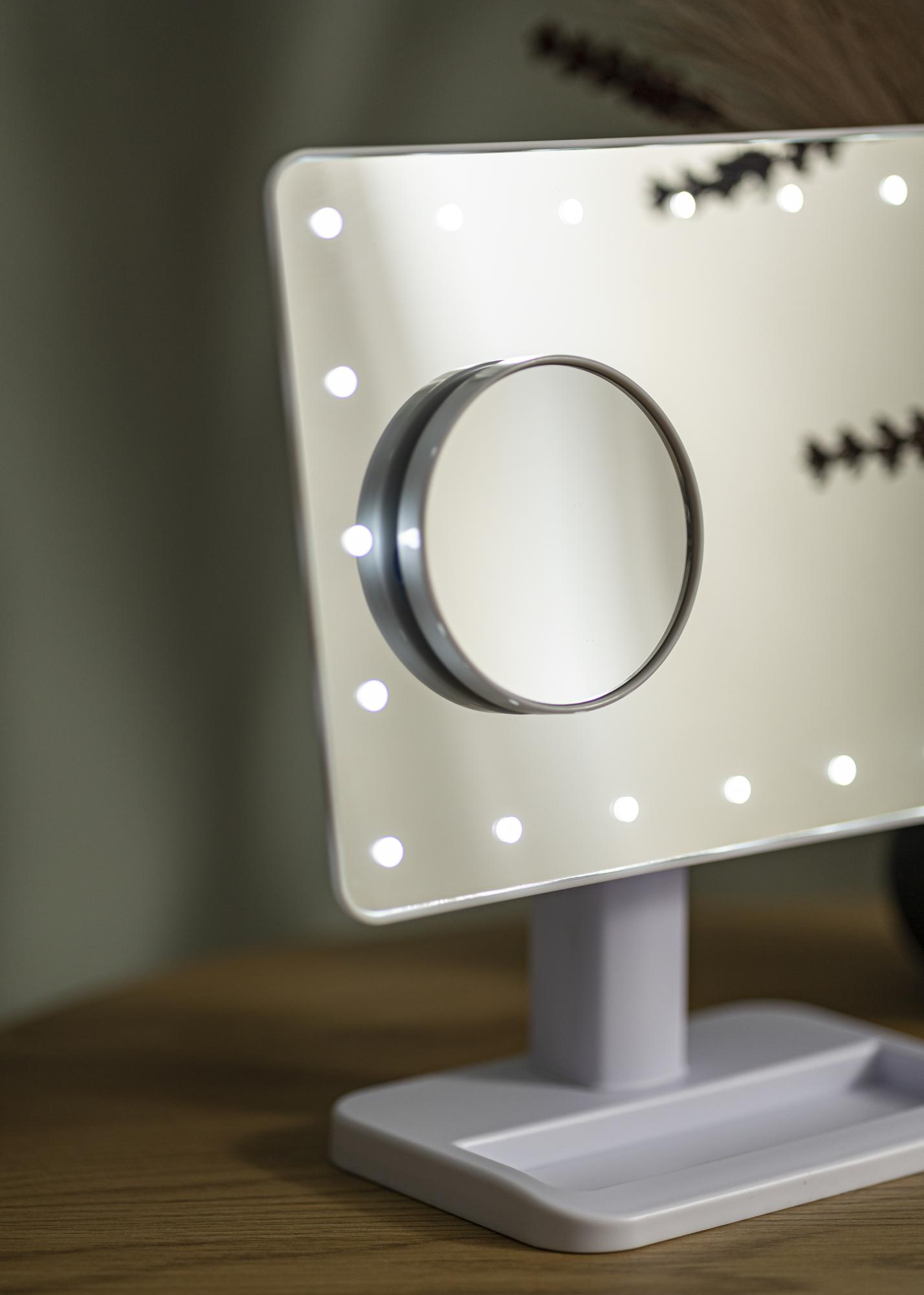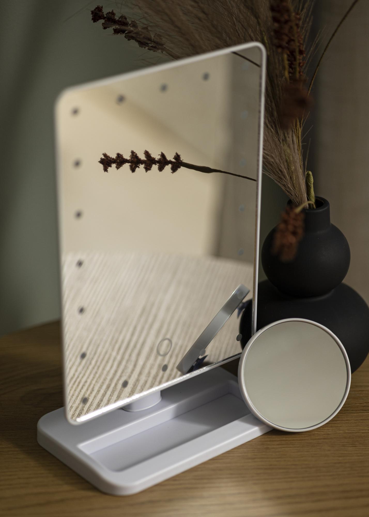 Die Spiegelfläche wird von LEDs dekorativ eingerahmt, die für ein gleichmäßiges Licht, optimal z.B. während des Schminkens, sorgen. LED-Beleuchtung ist eine vorteilhafte Lichtquelle, da sie energieeffektiv ist und eine lange Lebensdauer aufweist. Die LED-Beleuchtung dieses Spiegels wird mit einem Schalter auf der Spiegelrückseite eingeschaltet. Die Lichtstärke kann nach Belieben gedimmt werden, indem die Touch-Taste auf der Frontseite des Spiegels einige Sekunden lang gedrückt wird. Dieser Lichtspiegel wird mit 4x AA-Batterien betrieben. Die Batterien sind nicht im Lieferumfang enthalten.