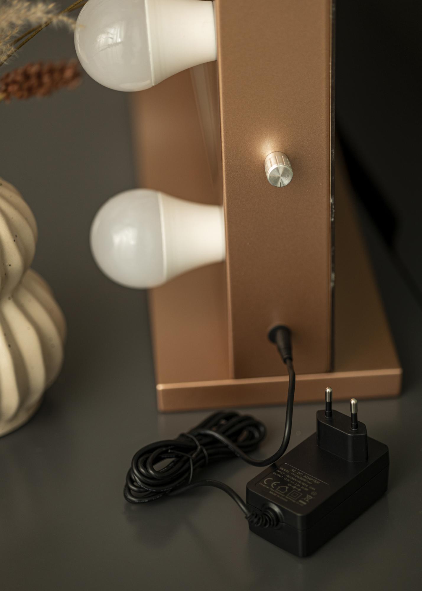 Der Spiegelrahmen in Roségold passt wunderbar zum Standfuß, der in der gleichen roségoldenen Farbnuance gehalten ist. So kann der LED-Spiegel einfach auf einem Tisch, einer Kommode, Anrichte oder einem Regal aufgestellt werden und macht einen echten Blickfang aus. Soll der Spiegel lieber als Wandspiegel mit Beleuchtung aufgehängt werden, ist auch das möglich. Hierfür einfach den Standfuß abmontieren und den Spiegel mit Hilfe der Halterungen auf der Rückseite des Spiegels an der Wand aufhängen. Der LED-Spiegel wird mit einem Stecker an den Strom angeschlossen.