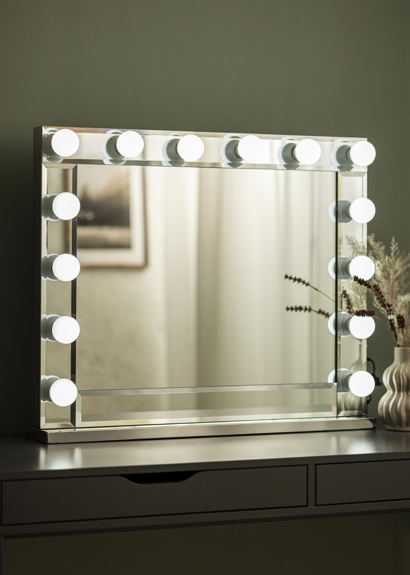 Verschönere dein Zuhause mit diesem Hollywood Make-Up Spiegel, einem Kosmetikspiegel in angesagtem, von Hollywood inspiriertem Design. Der Spiegel besitzt einen silberfarbenen Rahmen, der von 14 Glühlampen geschmückt wird, die dem Spiegel einen besonderen, luxuriösen Ausdruck verleihen. Die Leuchtmittel mit E27-Fassung können ausgetauscht werden, das Licht leuchtet mit kaltweißer Farbtemperatur. Die Beleuchtung ist dimmbar, sodass die Lichtstärke nach Belieben eingestellt werden kann. Beim Schminken und Auftragen von Make-Up ist ein helleres Licht vorteilhaft, wohingegen eine Hintergrundbeleuchtung gerne etwas gedimmt sein darf. Die Lichtstärke wird einfach mittels Drehschalter, der sich auf einer der kurzen Seiten des Spiegels befindet, eingestellt.