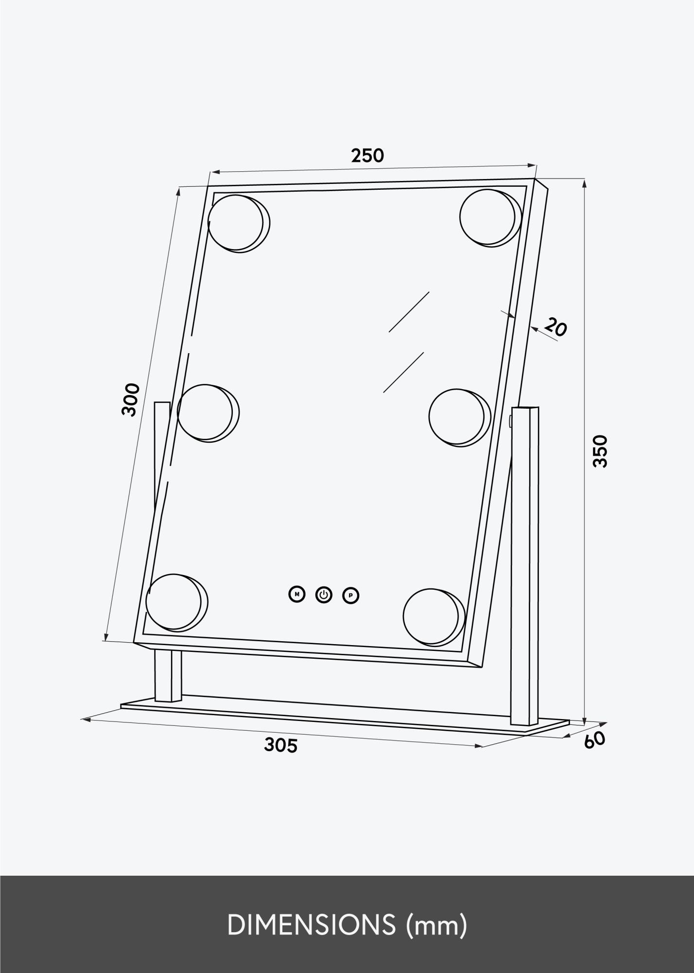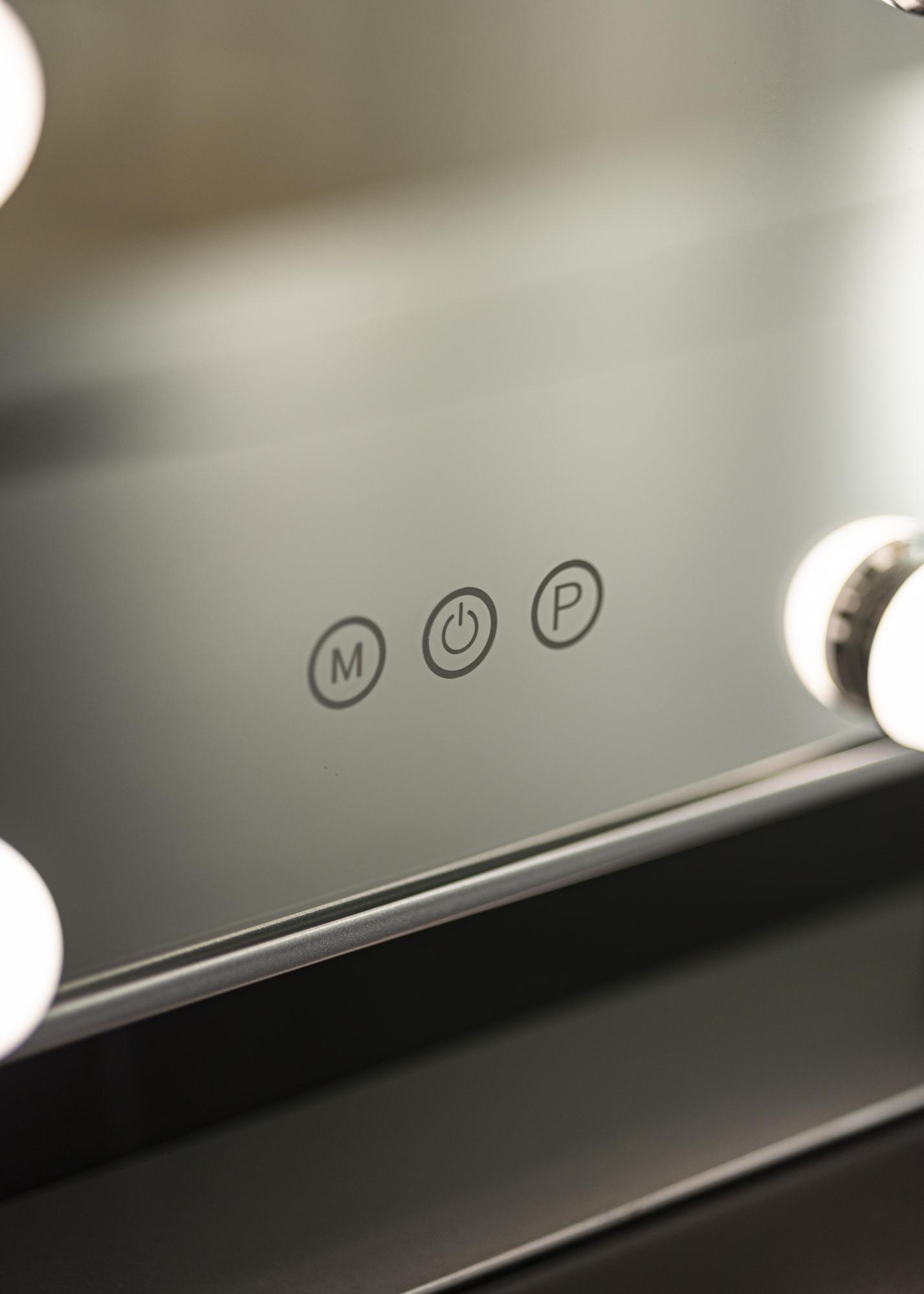 Mit diesem schönen Kosmetikspiegel von KAILA ziehen bei dir zuhause Stil und Glamour ein. Die moderate Größe dieses Schminkspiegels passt sowohl in Schlafzimmer, Ankleidezimmer oder Wohnzimmer und ist prima geeignet, sich für den Tag zurecht zu machen. Der LED-Spiegel zeichnet sich zudem durch das stilsichere, silberfarbene Design und die 6 Lampen, die die Spiegelfläche einrahmen, aus. Der Schminkspiegel verfügt über Touch-Tasten auf der Frontseite, womit die Beleuchtung schnell und einfach ein- und ausgeschaltet sowie eingestellt werden kann. Die mit einem ”M” gekennzeichnete Taste dient zur Wahl der Farbtemperatur und die „P“-Taste zum Einstellen der Lichtstärke.