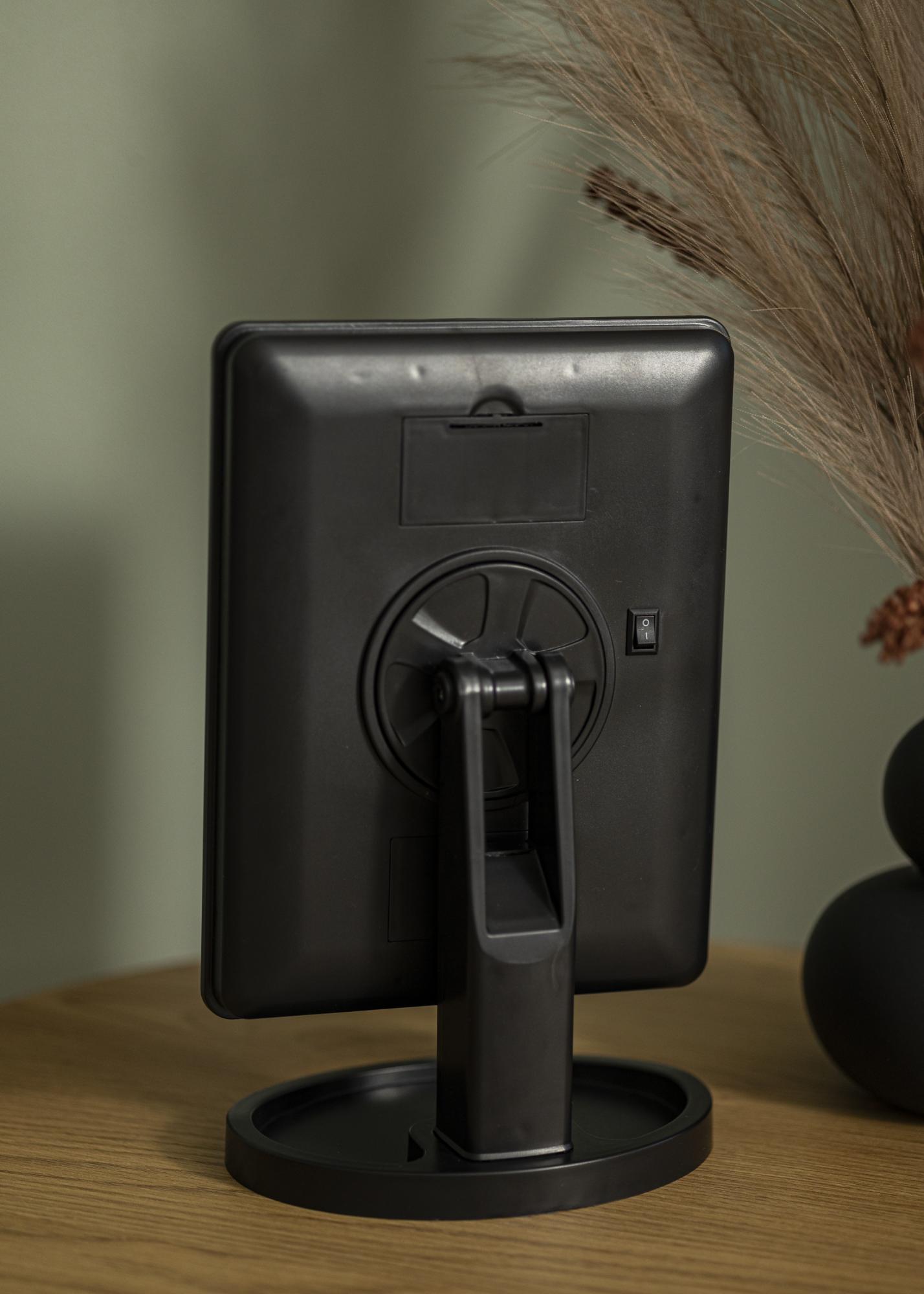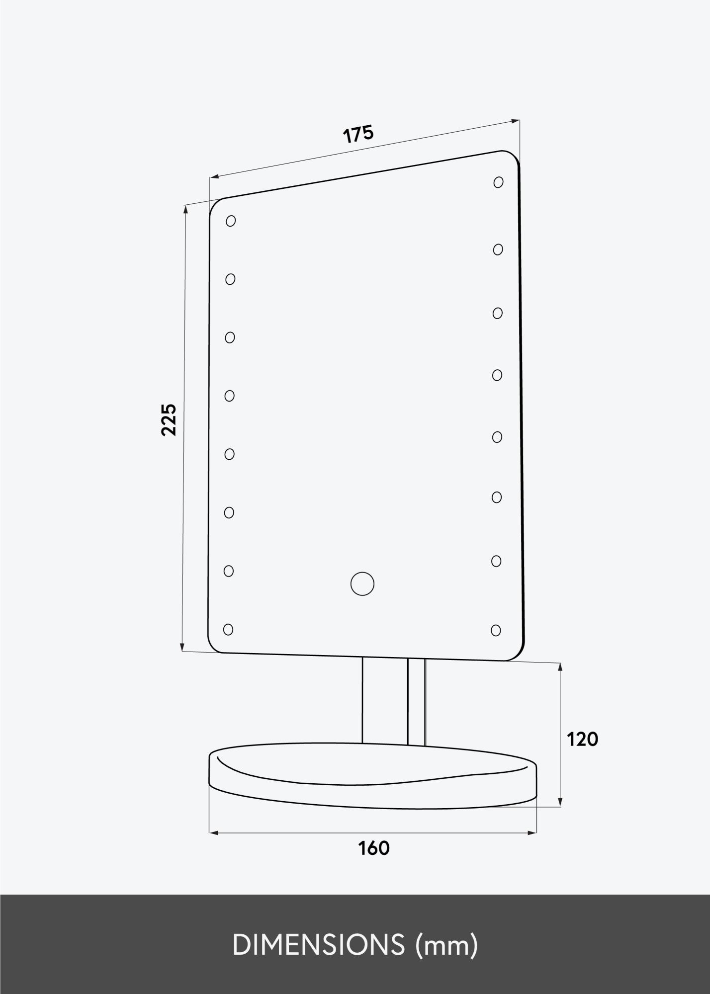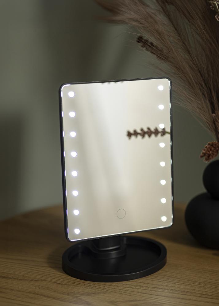Ein praktischer Kosmetikspiegel mit Standfuß, der über eine integrierte LED-Beleuchtung verfügt, die die 17,5x22,5 cm große Spiegelfläche an den Seitenrändern ziert. Das stilsichere Design in neutralem Schwarz macht diesen Lichtspiegel zu einem hübschen Einrichtungsgegenstand und einem echten kleinen Blickfang. Der Spiegel kann in der Neigung verstellt werden, sehr vorteilhaft, wenn Make-Up aufgetragen werden soll und man sich für den Tag zurechtmacht. Aufgrund der moderaten Größe dieses Schminkspiegels lässt sich dieser auch mühelos mitnehmen.