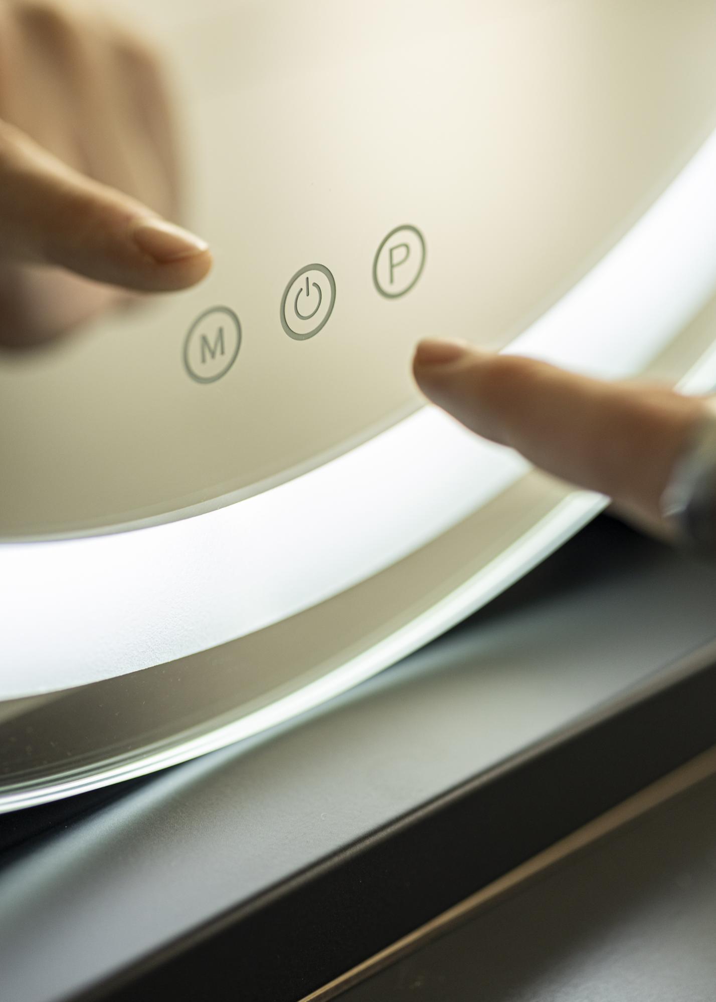 Dieser Schminkspiegel zum Aufstellen ist mit einem formschönen Standfuß in klassischem Schwarz ausgestattet und lässt sich aufgrund der neutralen Farbgebung mit nahezu jedem Wohnstil kombinieren. Der Spiegel mit runder Form und einem Durchmesser von 50 cm wird von einem integrierten, umlaufenden LED-Band hübsch eingerahmt. Im unteren Bereich der Spiegelfläche befinden sich drei Touch-Tasten: Eine Taste dient dem Ein- und Ausschalten der LED-Beleuchtung, mit der mit "M"-gekennzeichneten Taste kann die Farbtemperatur gewählt werden und mit Hilfe der "P"-Taste kann gedimmt werden, sodass der Spiegel in der gewünschten Lichtstärke leuchtet. Der LED-Spiegel wird mit einem Stecker an den Strom angeschlossen.