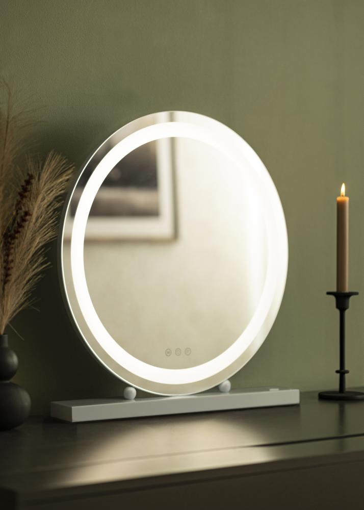 Suchst du einen formvollendeten Spiegel, der auf z.B. Tisch, Kommode, Anrichte oder Regal aufgestellt werden kann und als stilsicheres, schönes Einrichtungsaccessoire dein Interieur verschönert? Dann könnte genau dieser runde LED-Spiegel mit stilvollem Standfuß in Weiß und der integrierten LED-Beleuchtung der gesuchte Wohnspiegel sein. Dieser Spiegel ist ein absoluter Hingucker und ein wirklich dekoratives und natürlich auch funktionelles Einrichtungsdetail. Die LED-Beleuchtung dieses Kosmetikspiegels besteht aus einem integrierten, umlaufenden LED-Band, das einfach via Touch-Taste auf der Spiegelfläche ein- und ausgeschaltet werden kann. Hier befinden sich auch die weiteren Touch-Tasten, um die Beleuchtung des Spiegels einzustellen; die mit "M" gekennzeichnete Taste dient der Wahl der Farbtemperatur und mit der "P"-Taste kann gedimmt, also die gewünschte Lichtstärke eingestellt werden.
