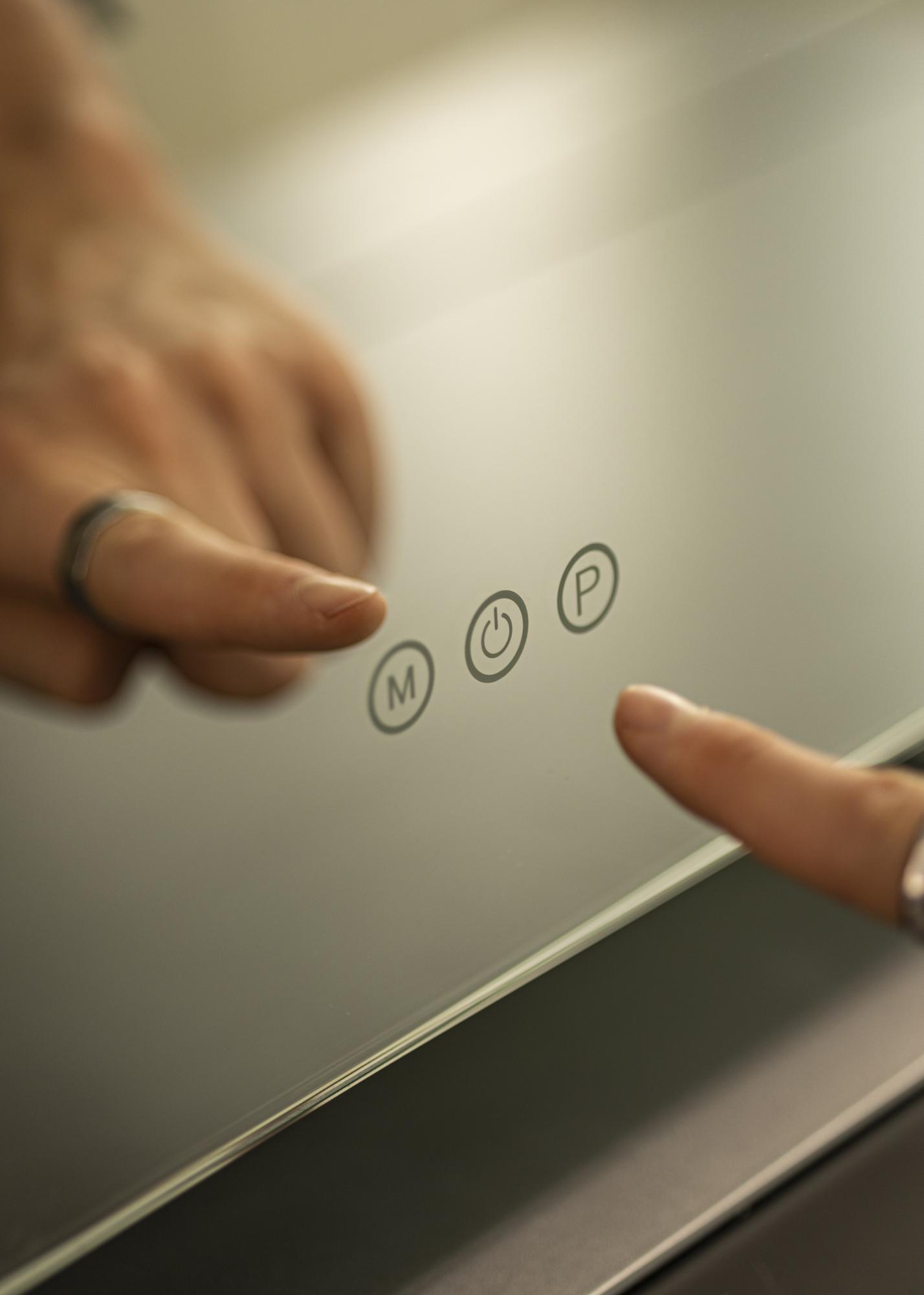 Ein eleganter Make-Up Spiegel kann jedem Raum zu einer glamouröseren, eleganteren Atmosphäre verhelfen. Dieser Kosmetikspiegel mit integrierter, dimmbarer LED-Beleuchtung kann zudem für eine besondere Stimmung sorgen, z.B. durch eine ansprechende Hintergrundbeleuchtung im Wohnzimmer oder ein helleres Licht in der Schminkecke am Schminktisch. Um die Beleuchtung je nach Situation und Bedarf anzupassen, werden einfach die Touch-Tasten im unteren Bereich des Spiegels genutzt. Die "M"-Taste dient zur Einstellung der Farbtemperatur und die "P"-Taste zum Einstellen der Lichtstärke. Außerdem gibt es eine Taste zum Ein- und Ausschalten der LED-Beleuchtung des Spiegels. Der Stromanschluss des LED-Spiegels erfolgt über einen Stecker.